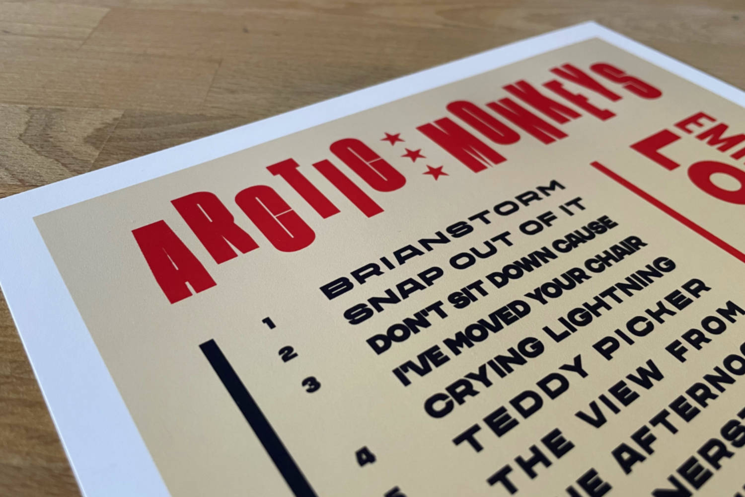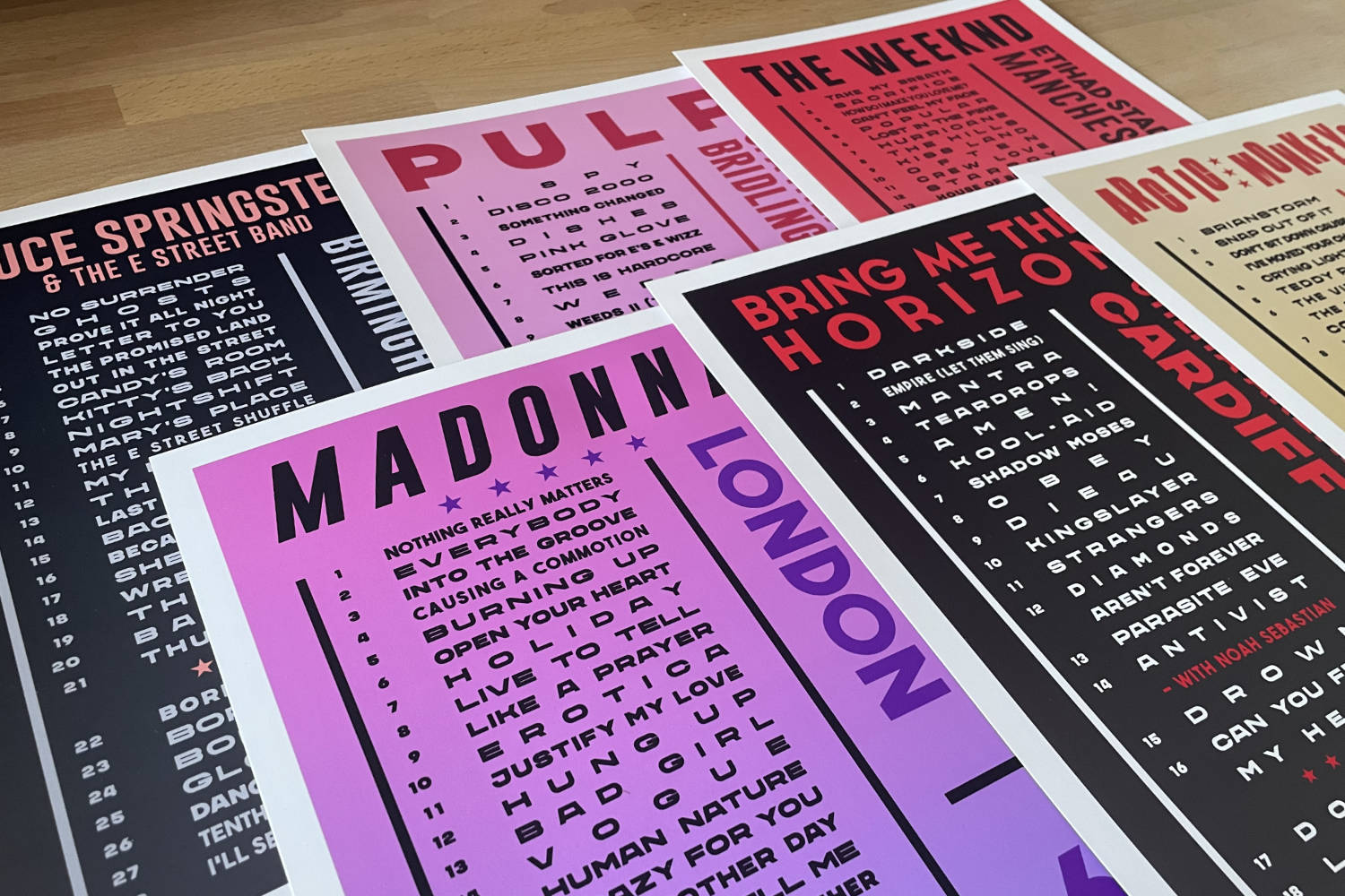 The typography is laid out specifically for each concert and inspired by retro, text-only gig posters and flyers. Set lists are correct for every gig based on the data from the top setlist wiki, setlist.fm.