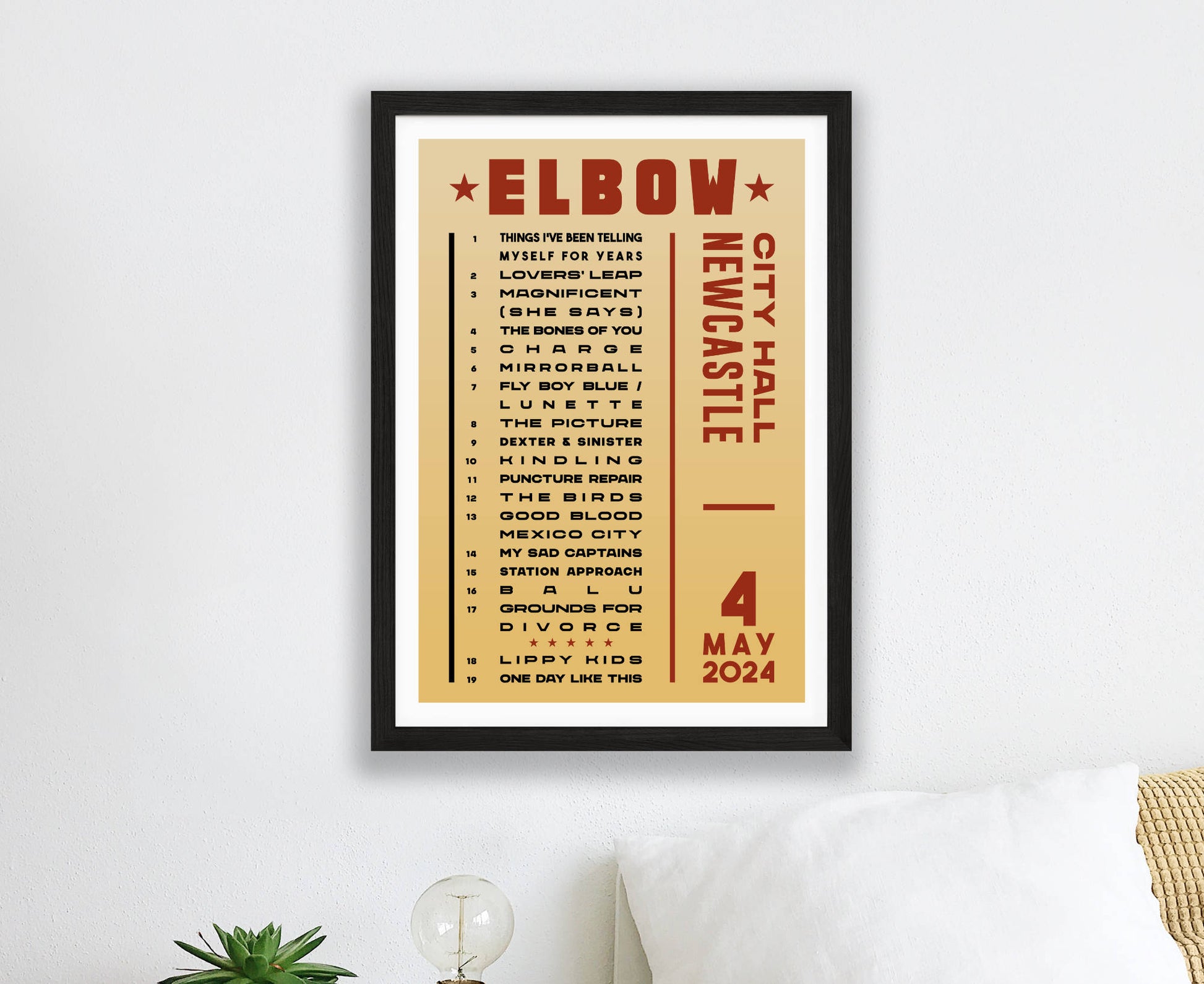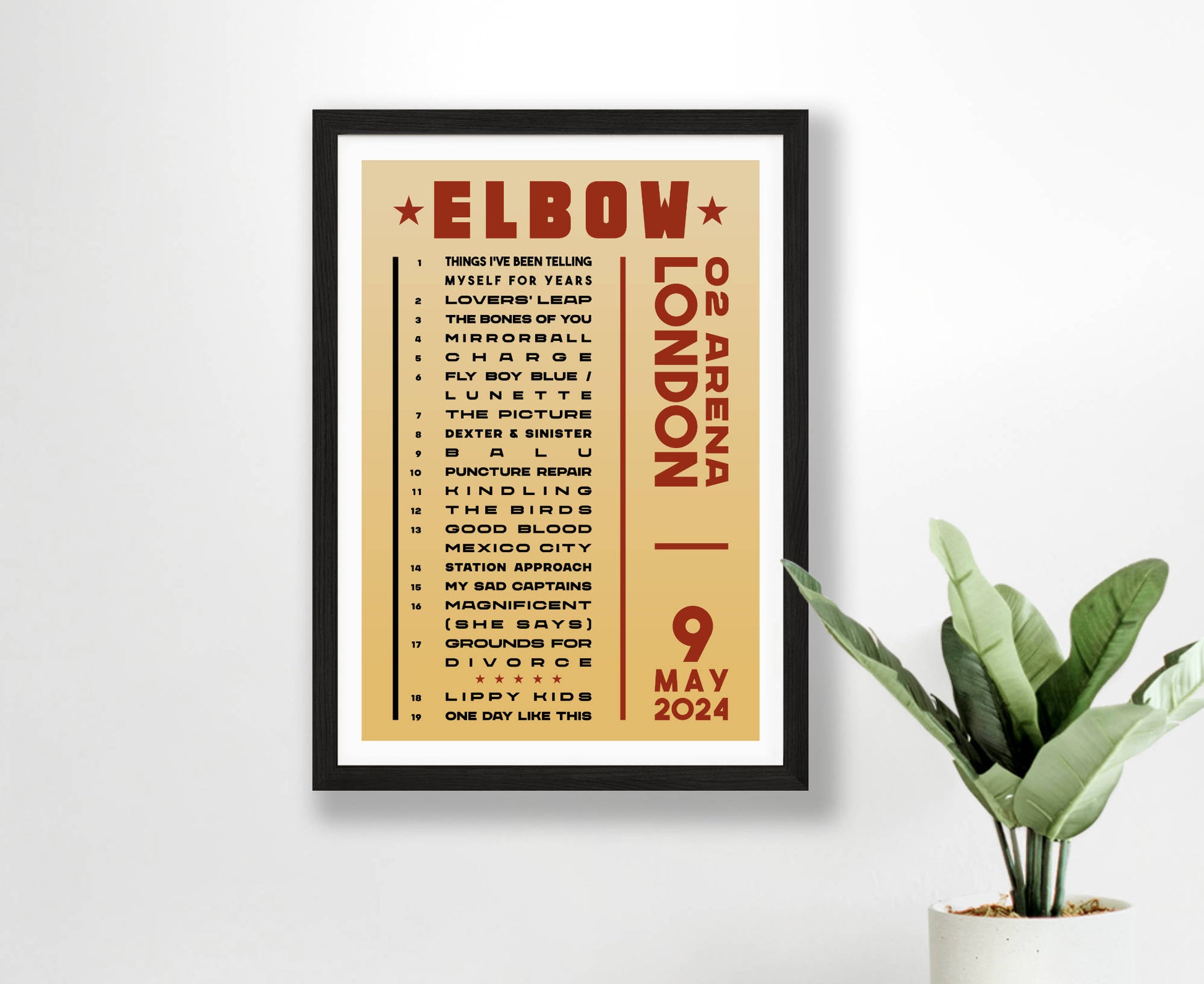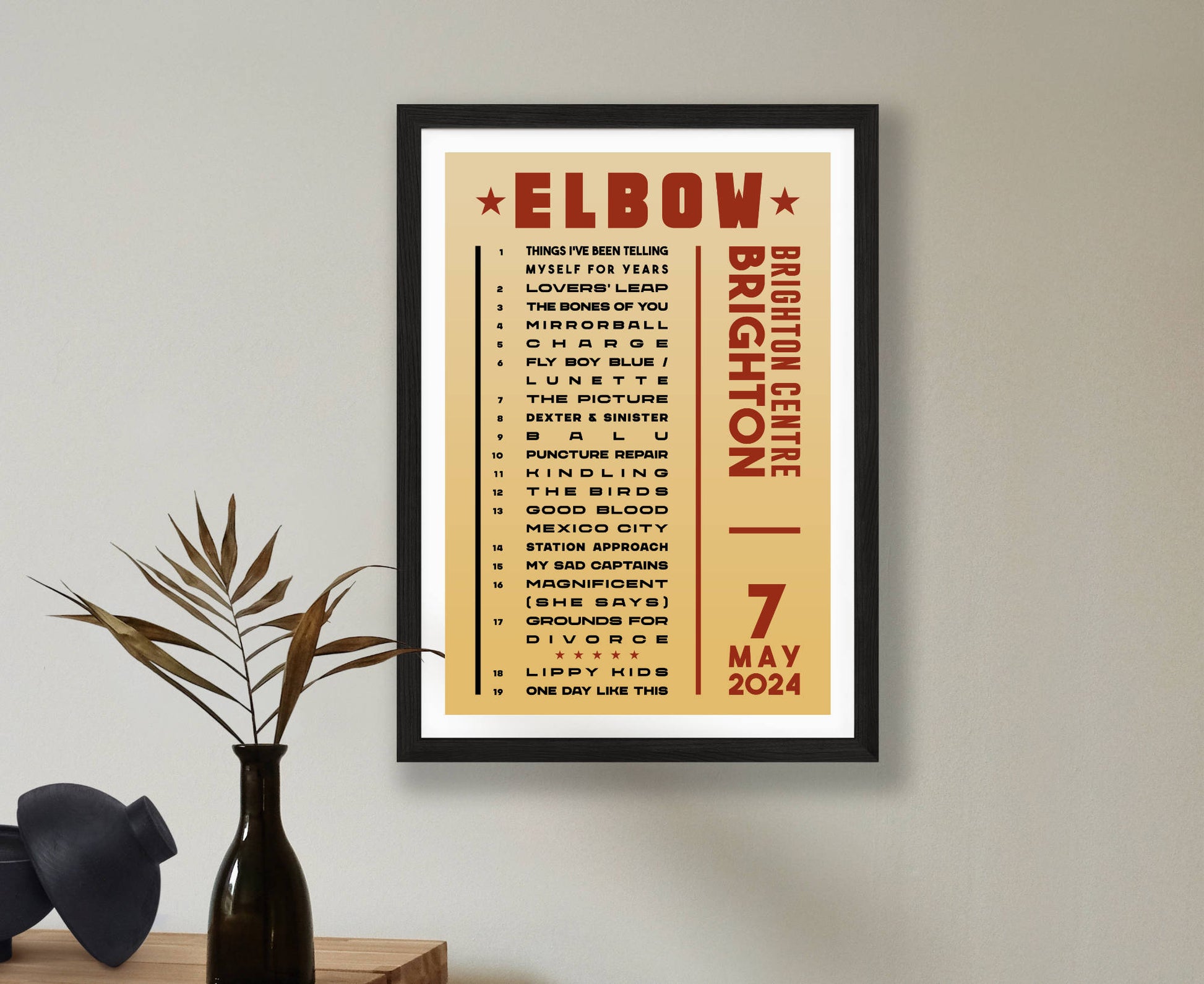 Celebrate a great live experience with an original typographic poster print featuring the set list of songs played on Elbow's 2024 Audio Vertigo tour. The colour scheme is dark red and black on a yellow gradient.