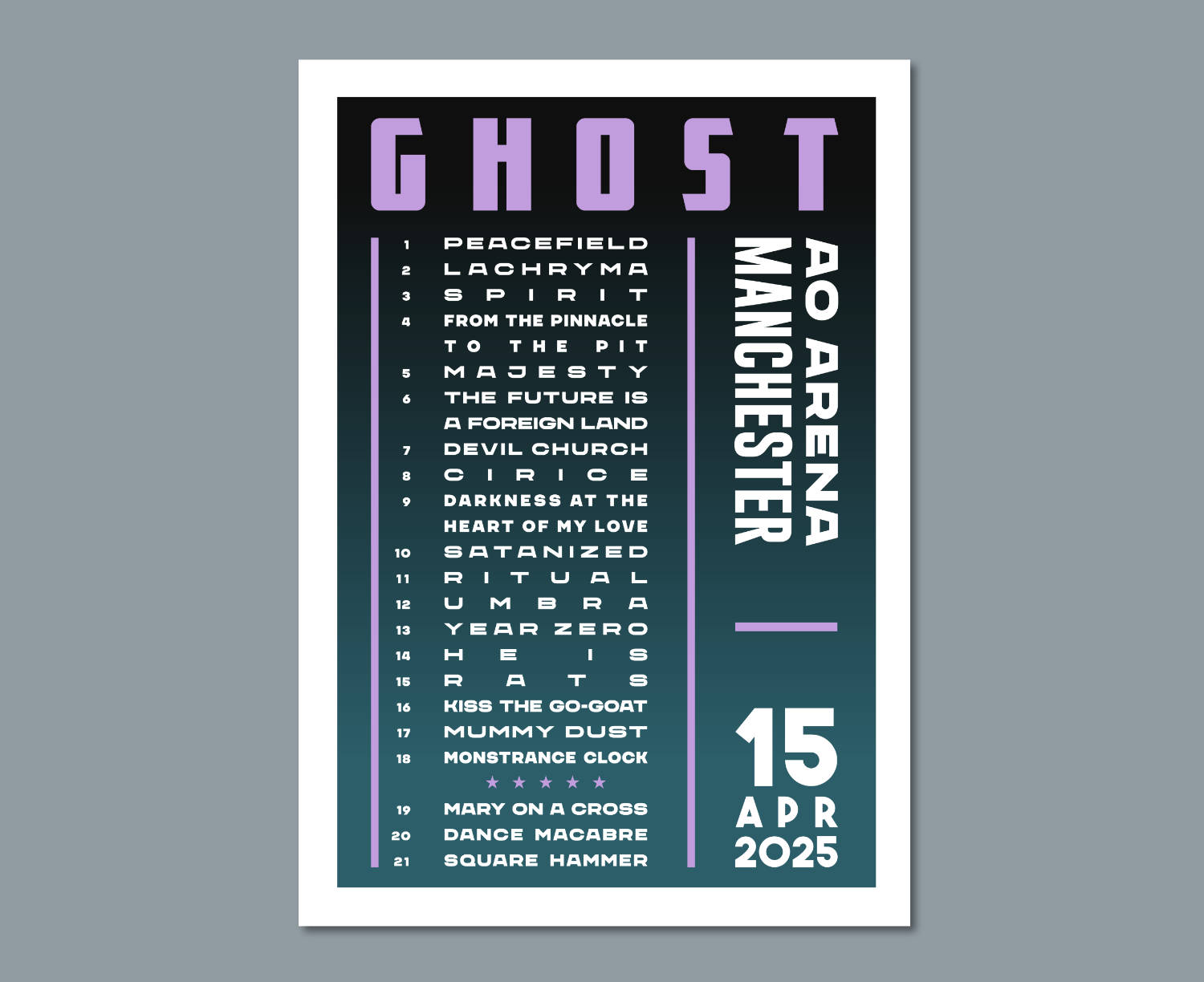 Celebrate an awesome live show with an original typographic poster print featuring the set list of songs played on Ghost's 2025 arena tour. The colour scheme is white and purple on a dark blue gradient.