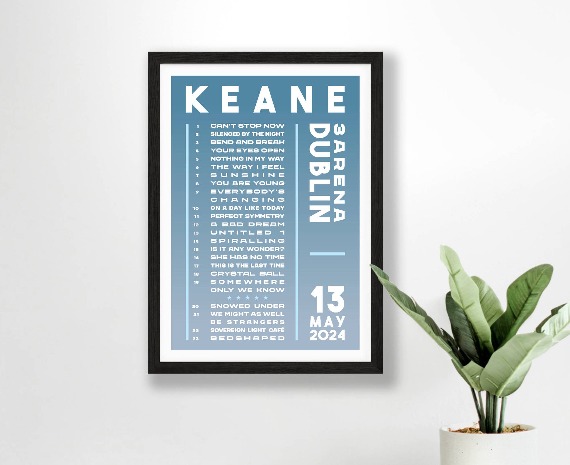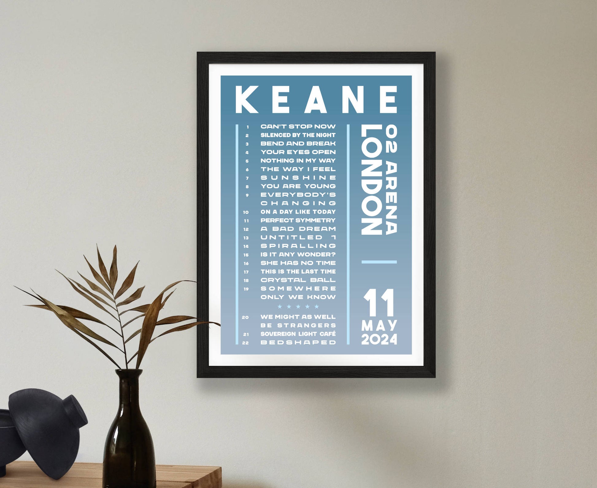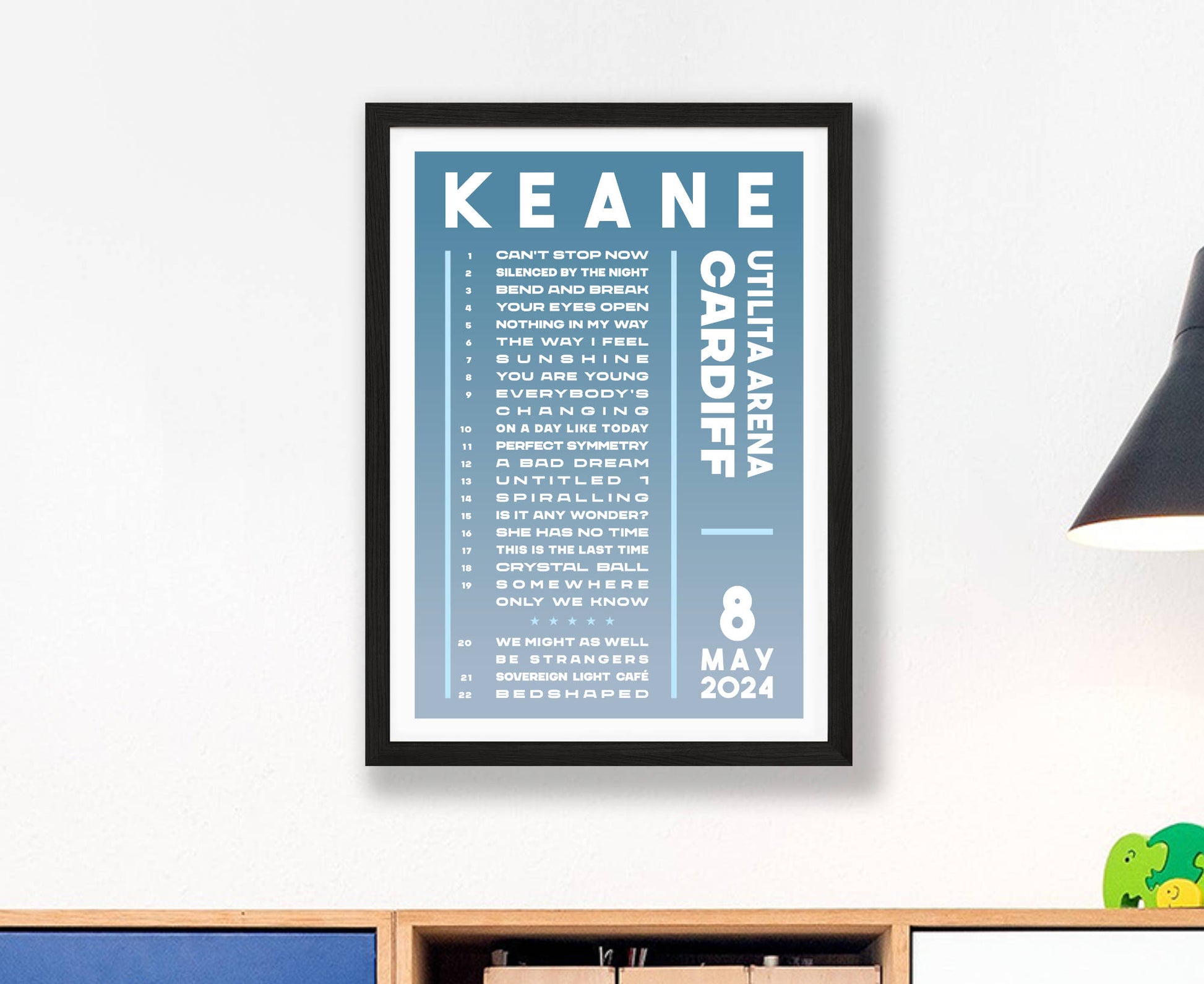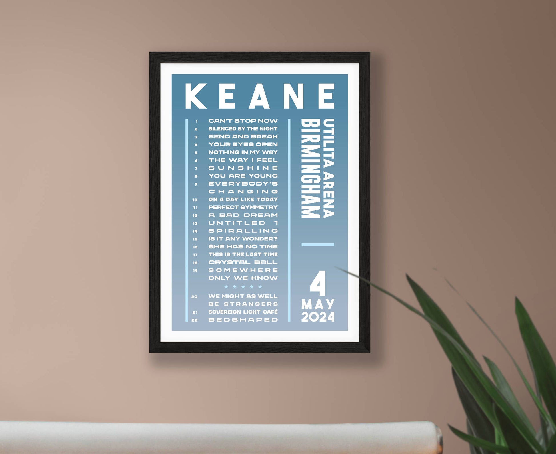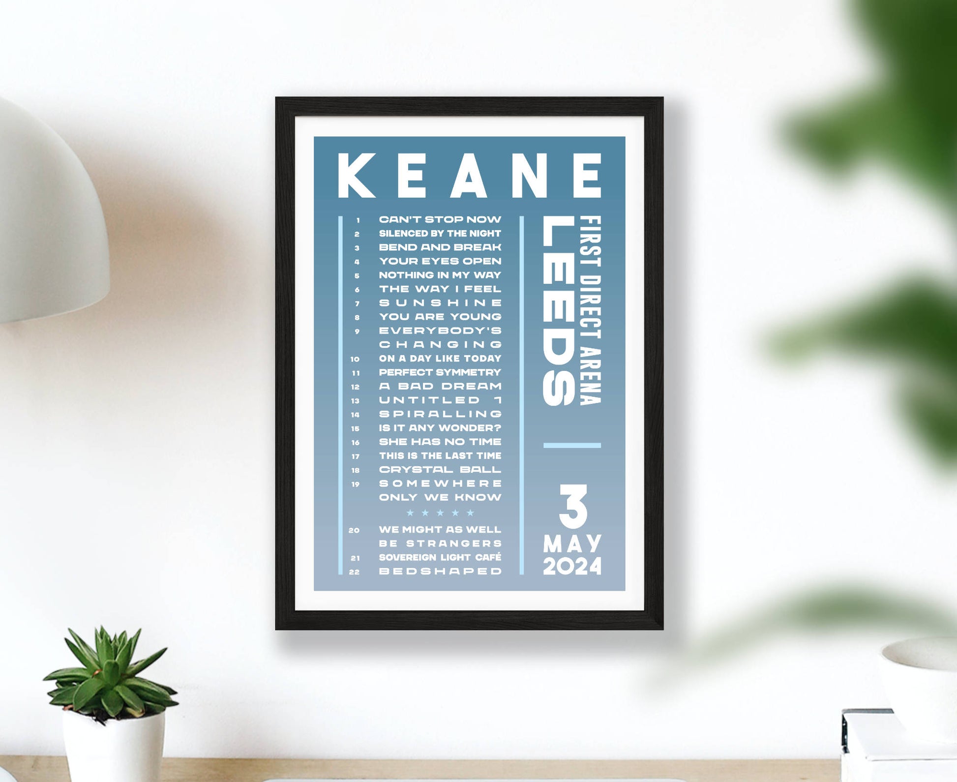 Celebrate a great live show with an original typographic poster print featuring the set list of songs played on Keane's 2024 20th anniversary of Hopes and Fears tour. The colour scheme is white on a light blue gradient.