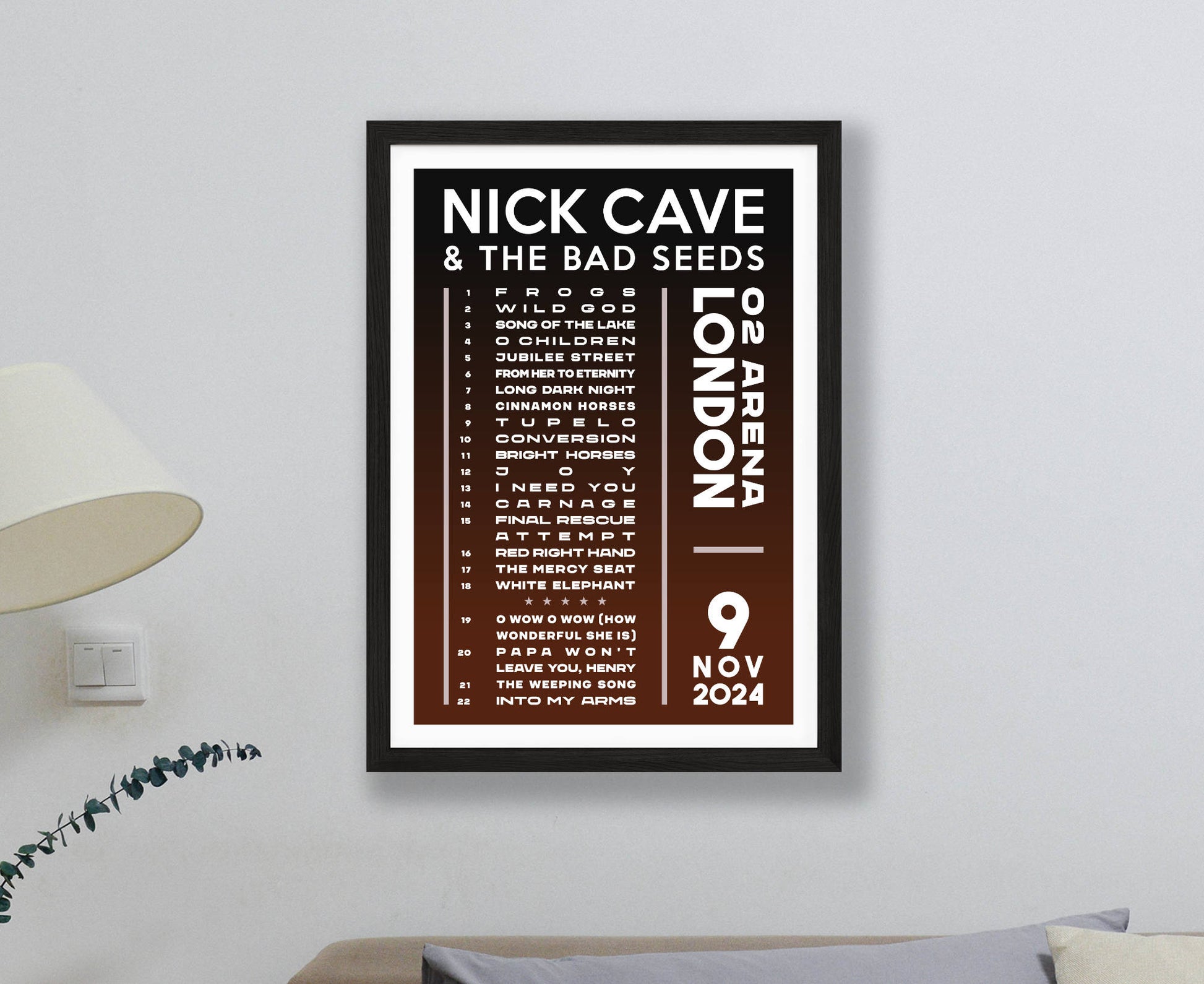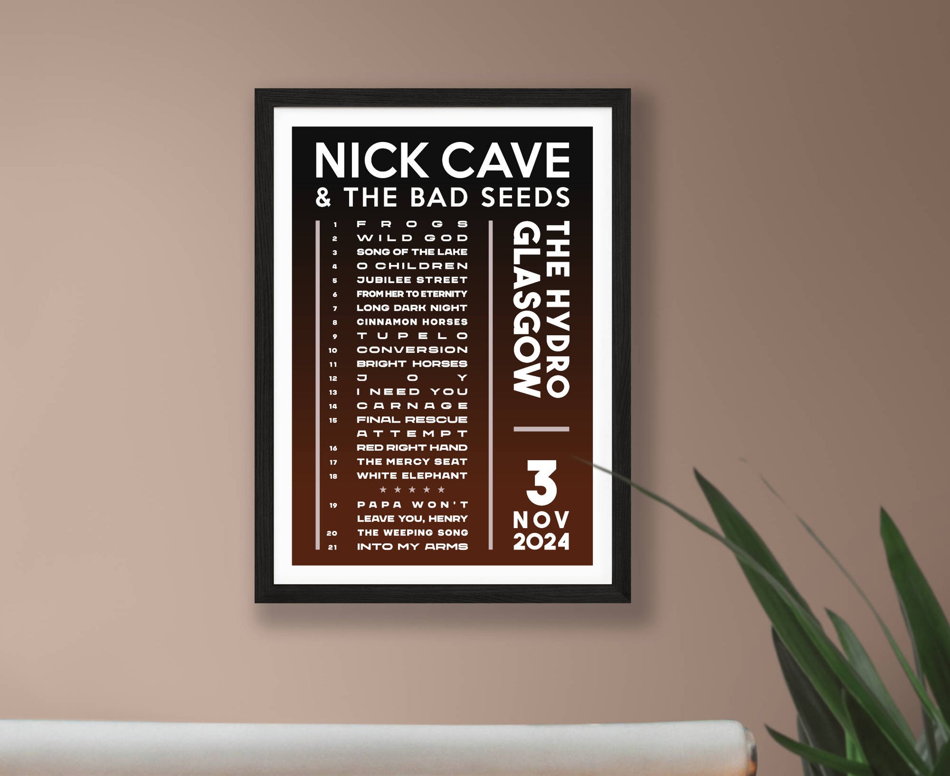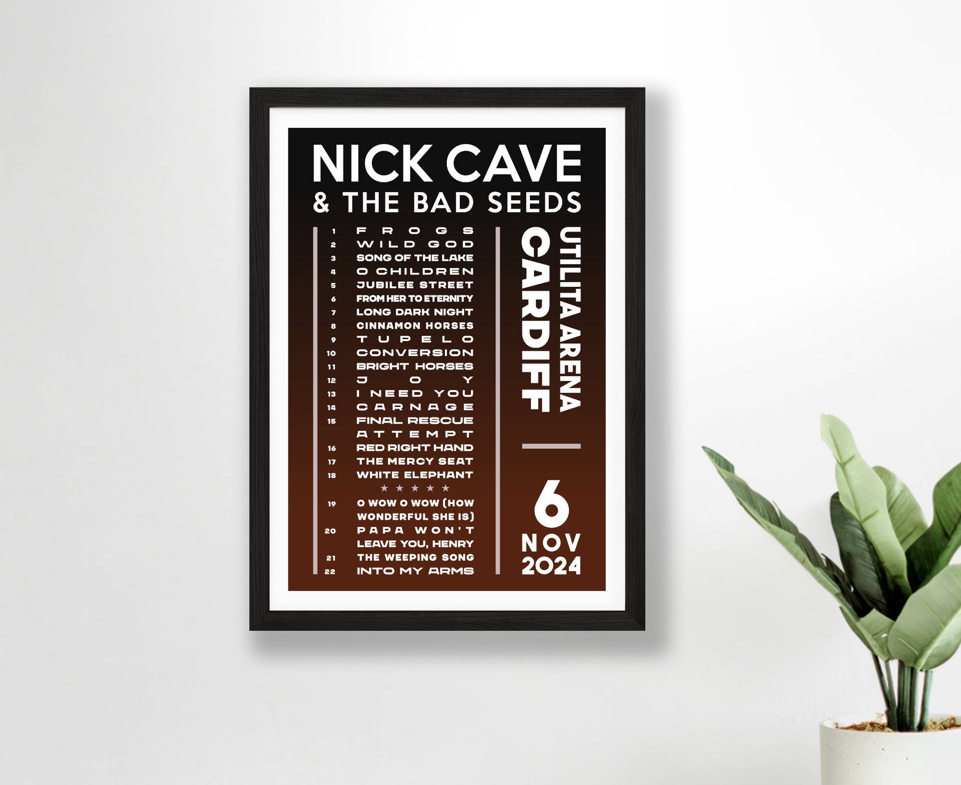 Celebrate an amazing live performance with an original typographic poster print featuring the set list of songs played at Nick Cave and the Bad Seeds's 2024 UK & Ireland gigs. White text on a black/dark red gradient background.