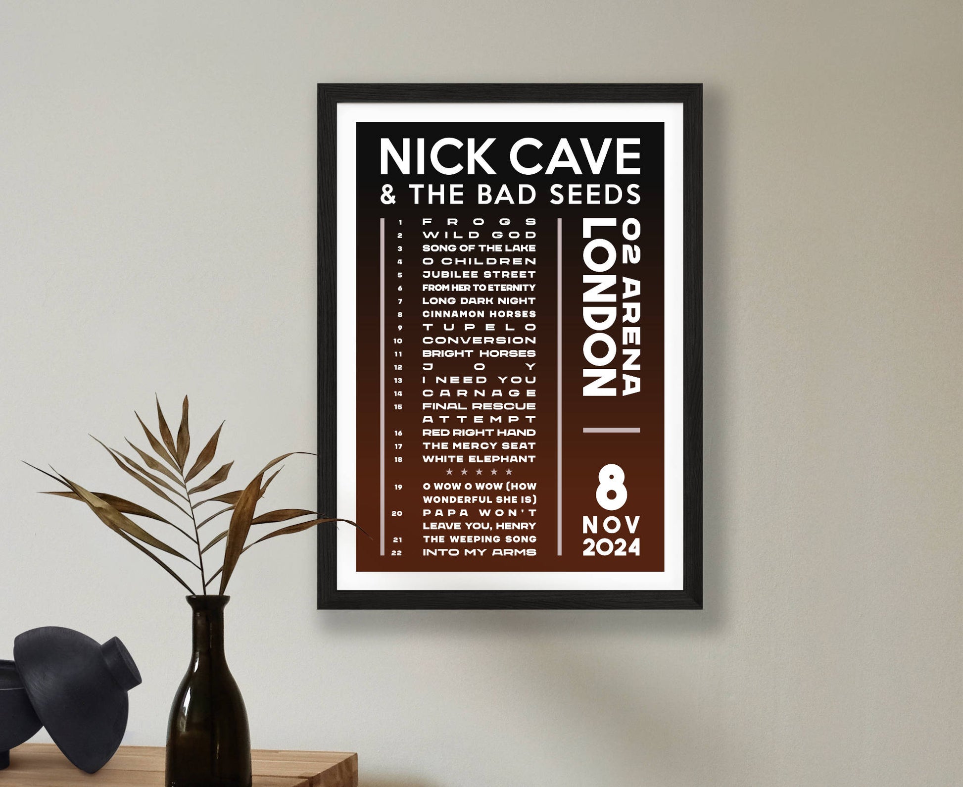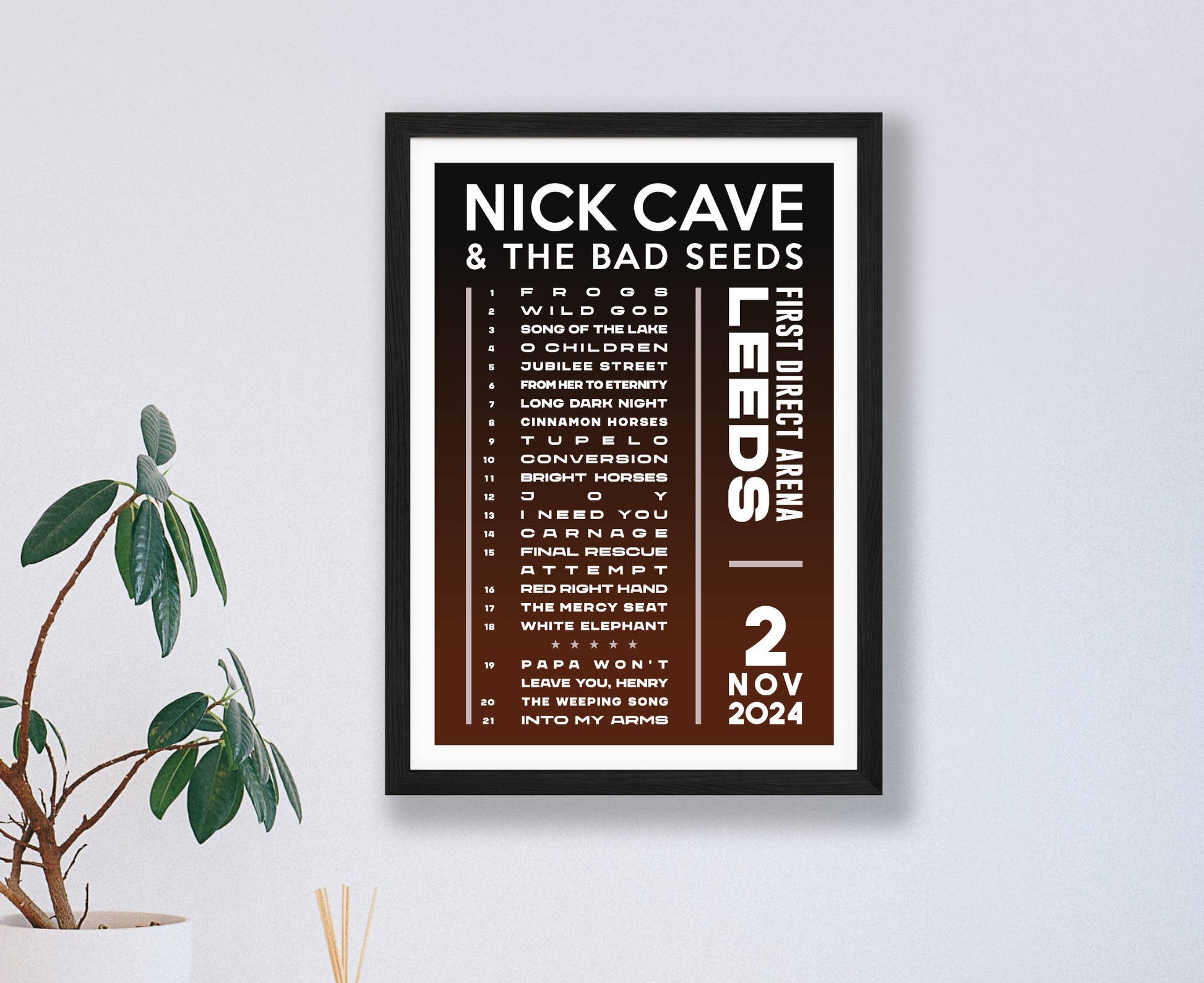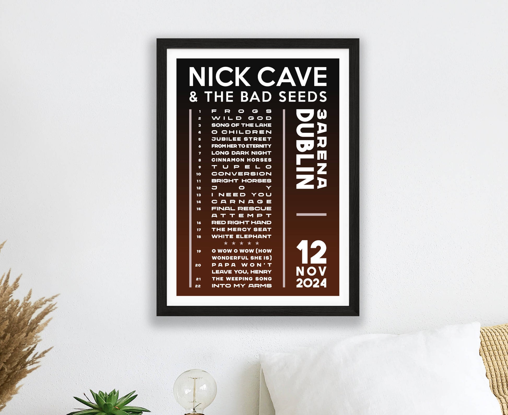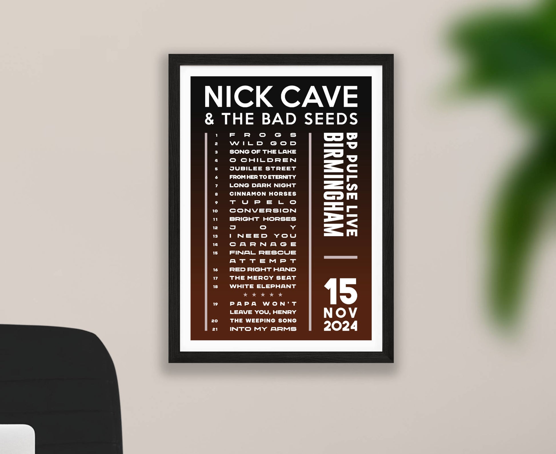 Celebrate an amazing live performance with an original typographic poster print featuring the set list of songs played at Nick Cave and the Bad Seeds's 2024 UK & Ireland gigs. White text on a black/dark red gradient background.