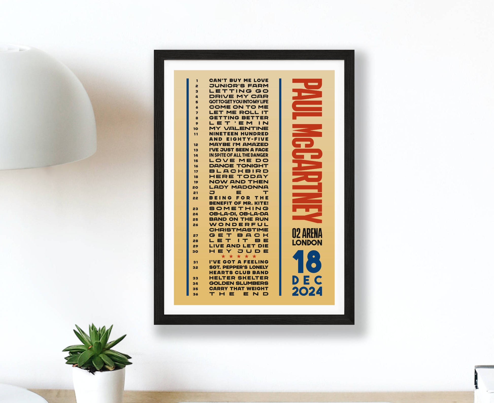 Celebrate an incredible live show with an original typographic poster print featuring the set list of songs played at Paul McCartney's 2024 UK arena shows. The colour scheme is red, blue and black on a yellow/beige gradient.