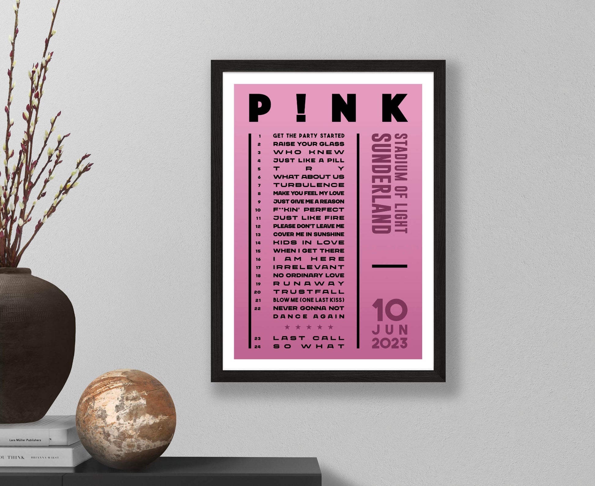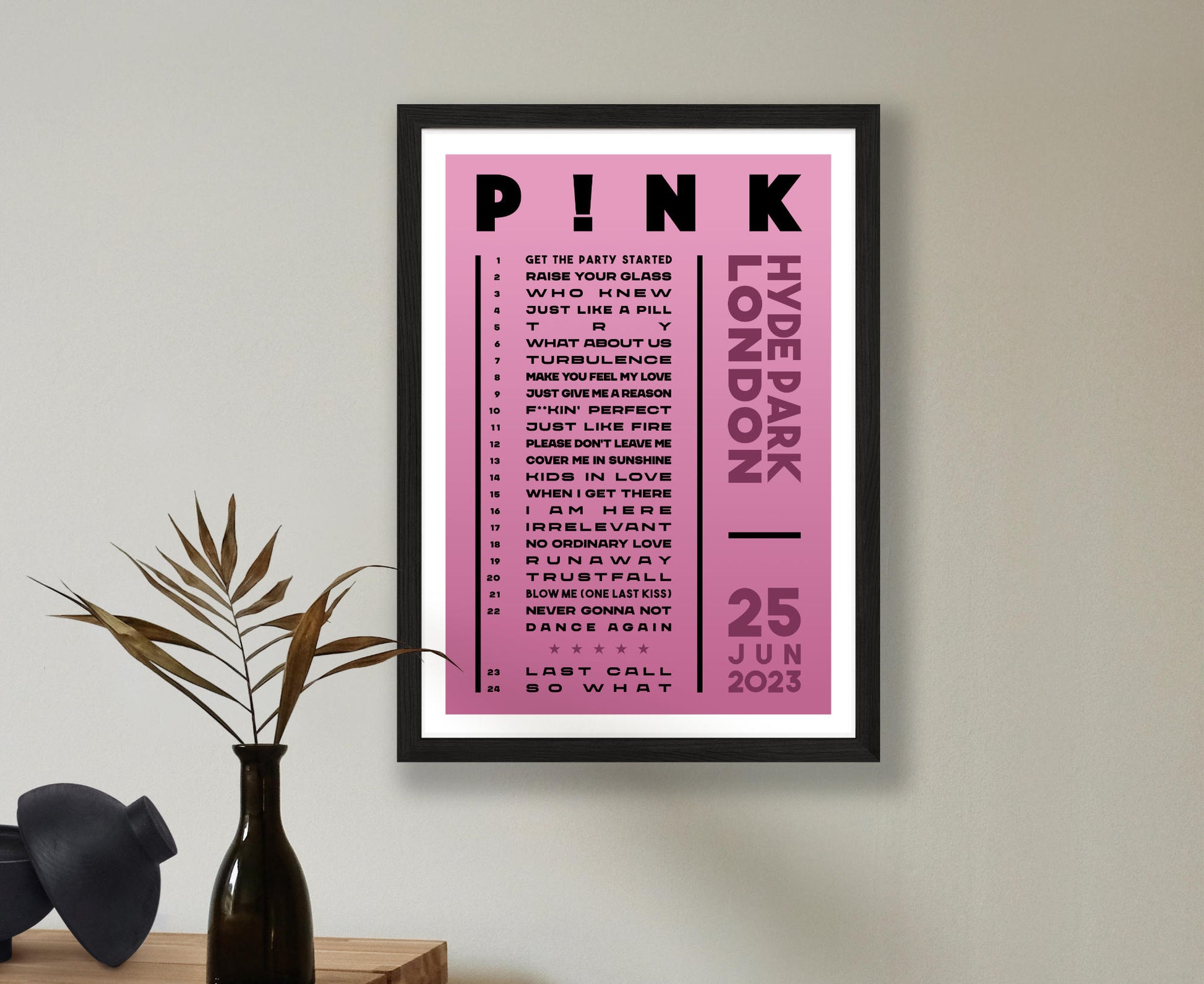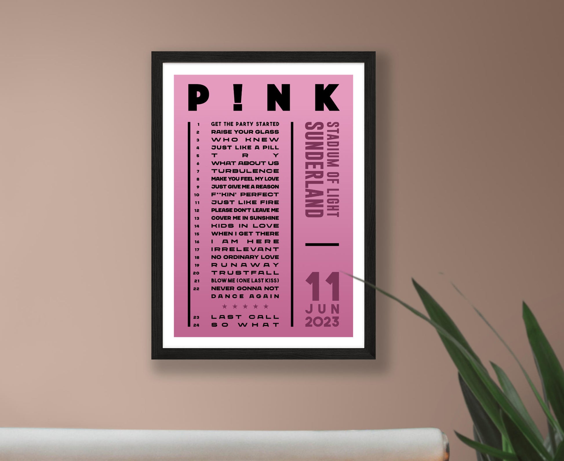 Celebrate an amazing live experience with an original typographic poster print featuring the set list of songs played at P!nk's 2023 UK gigs. The colour scheme is black on a light/dark pink gradient.