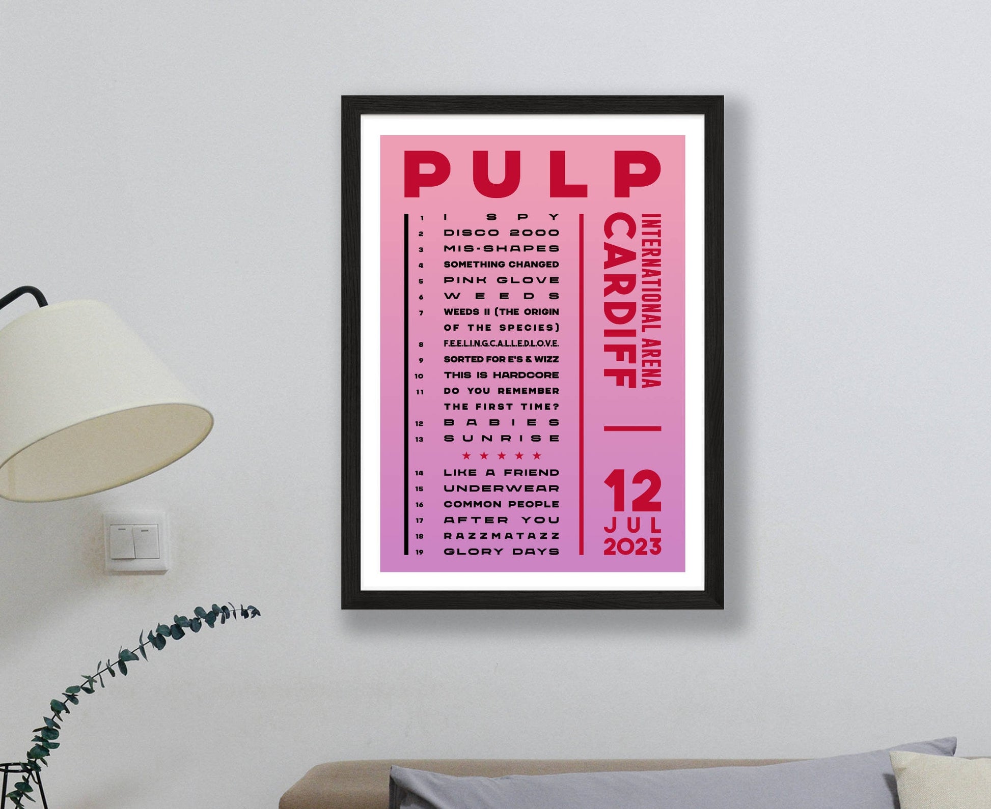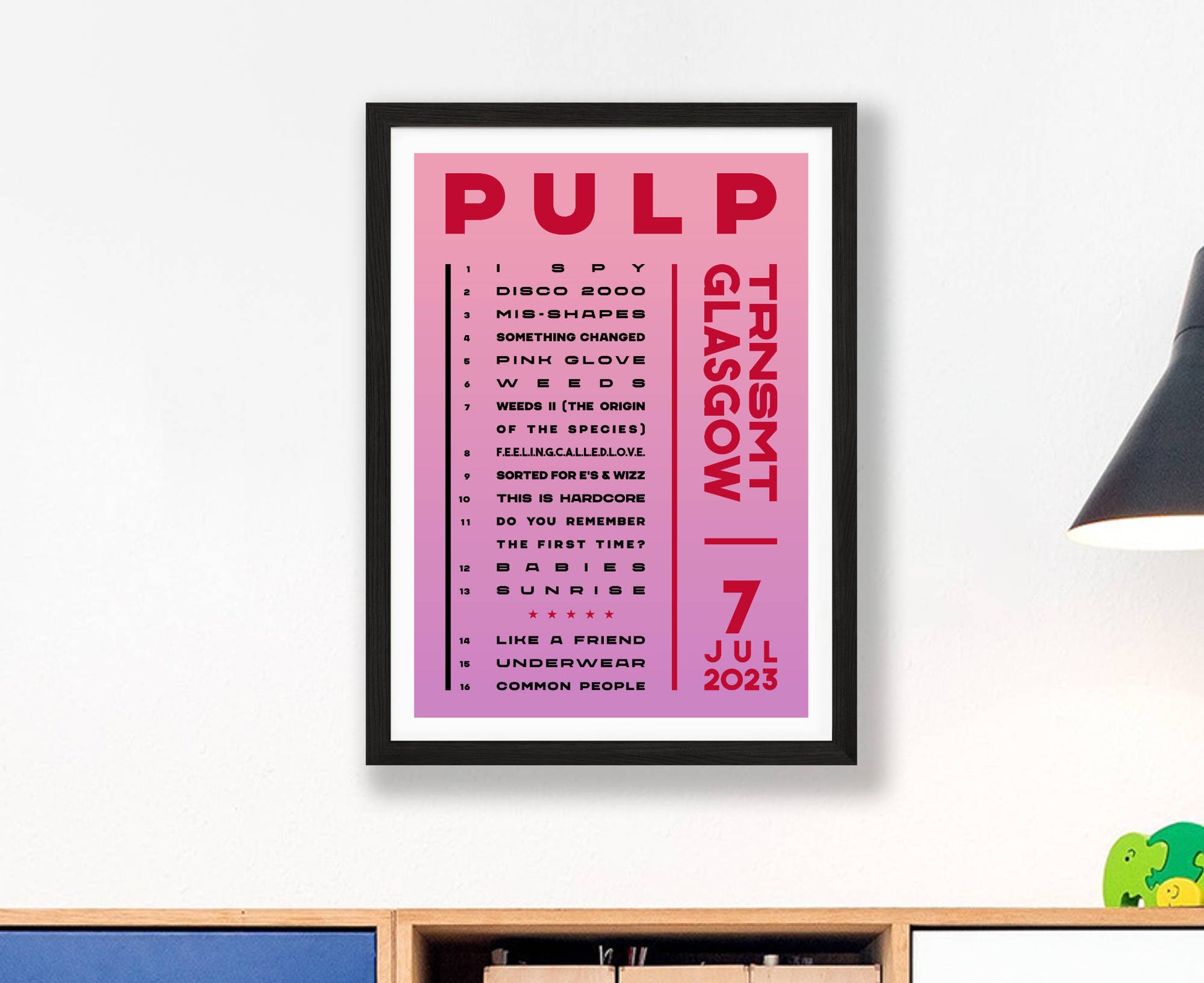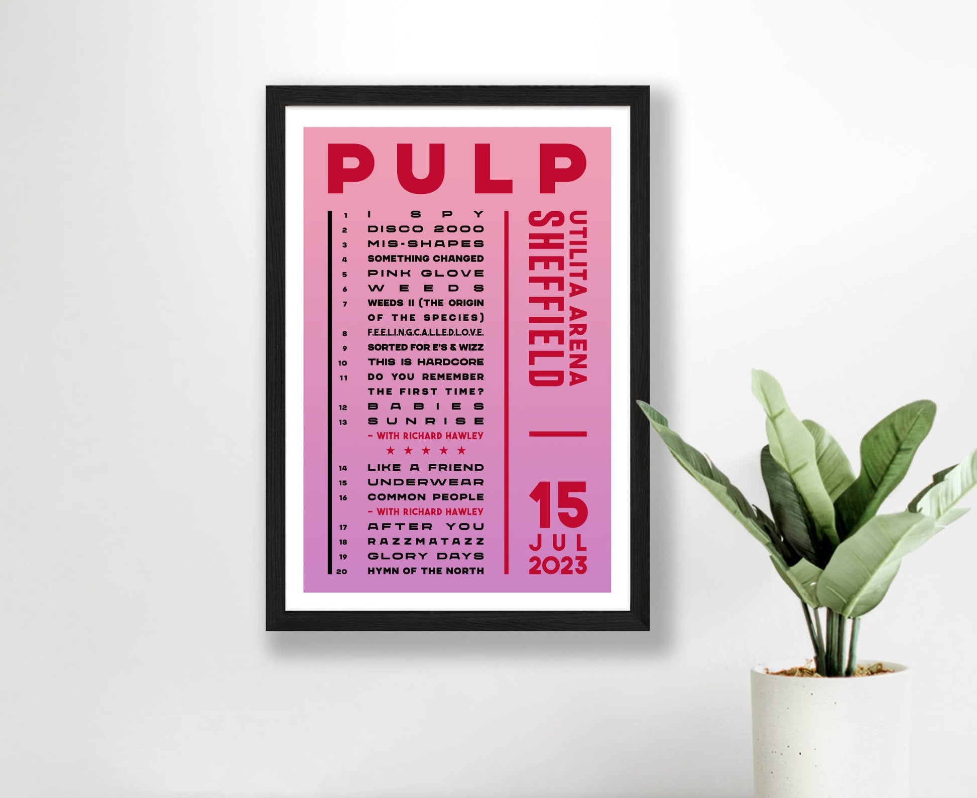Celebrate a great night out with an original typographic poster print featuring the set list of songs played at Pulp's 2023 UK gigs. The colour scheme is red and black on a pink/purple gradient.