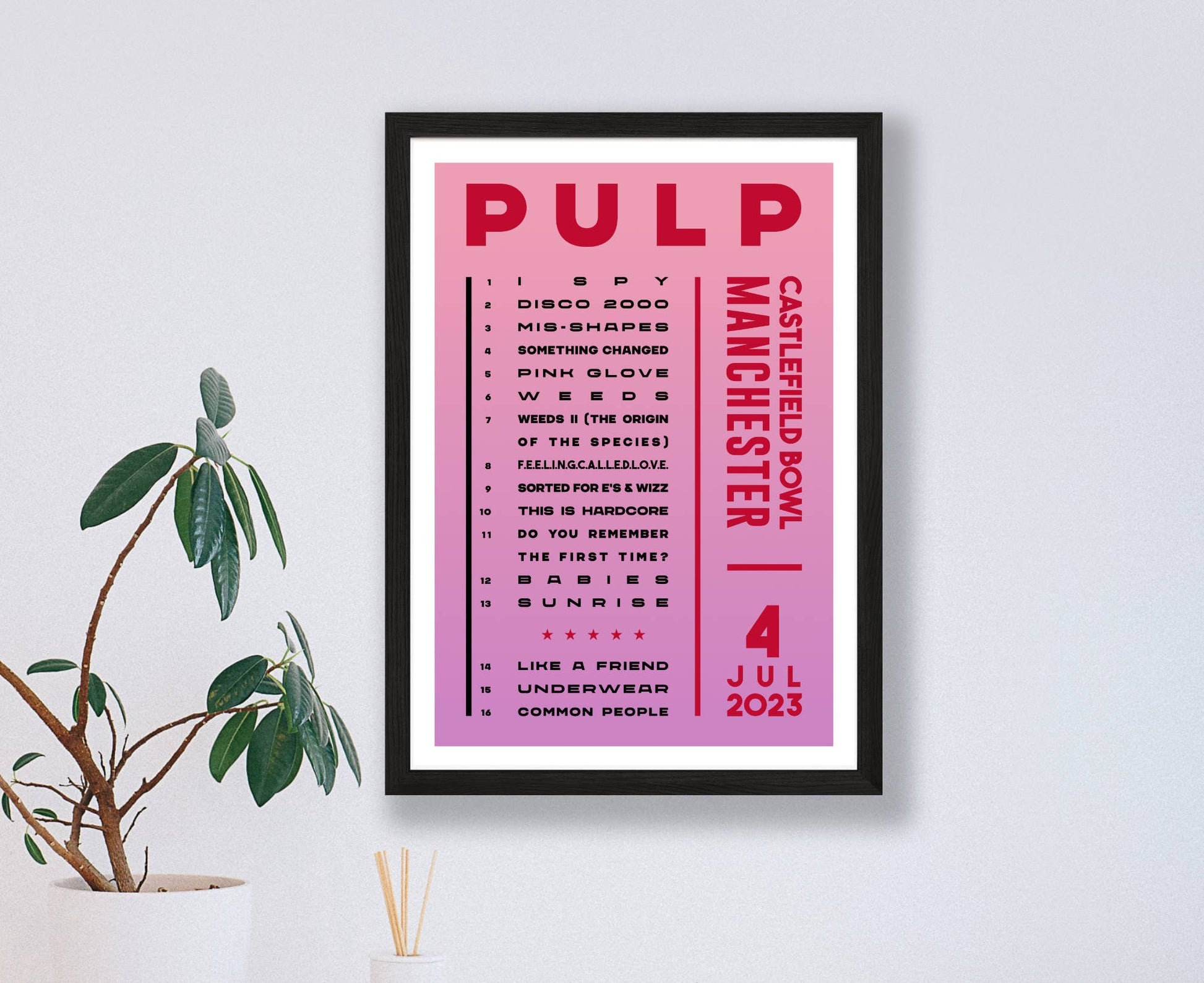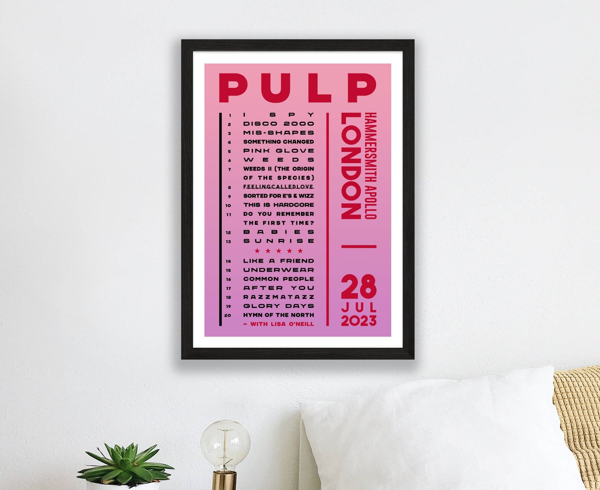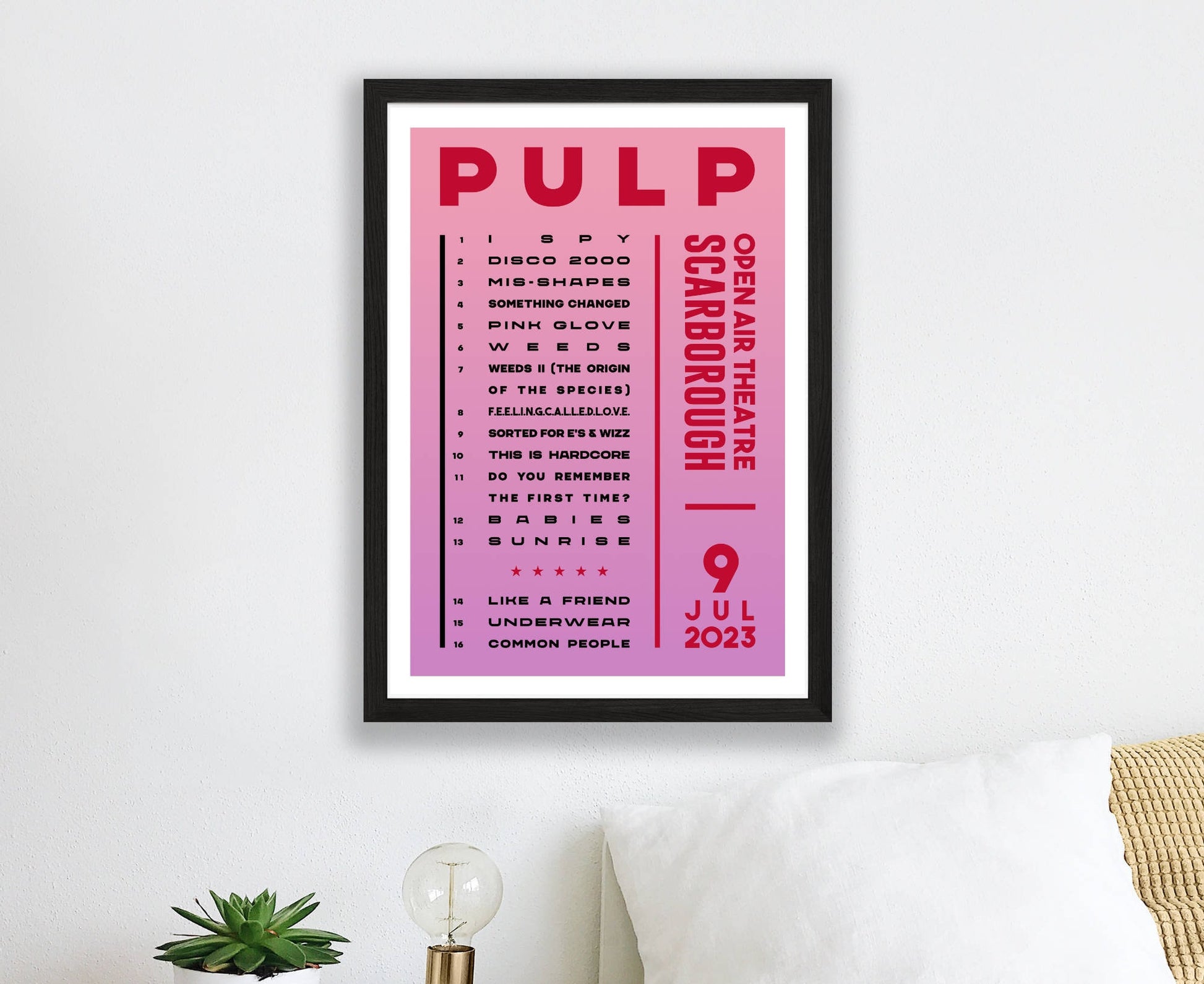 Celebrate a great night out with an original typographic poster print featuring the set list of songs played at Pulp's 2023 UK gigs. The colour scheme is red and black on a pink/purple gradient.