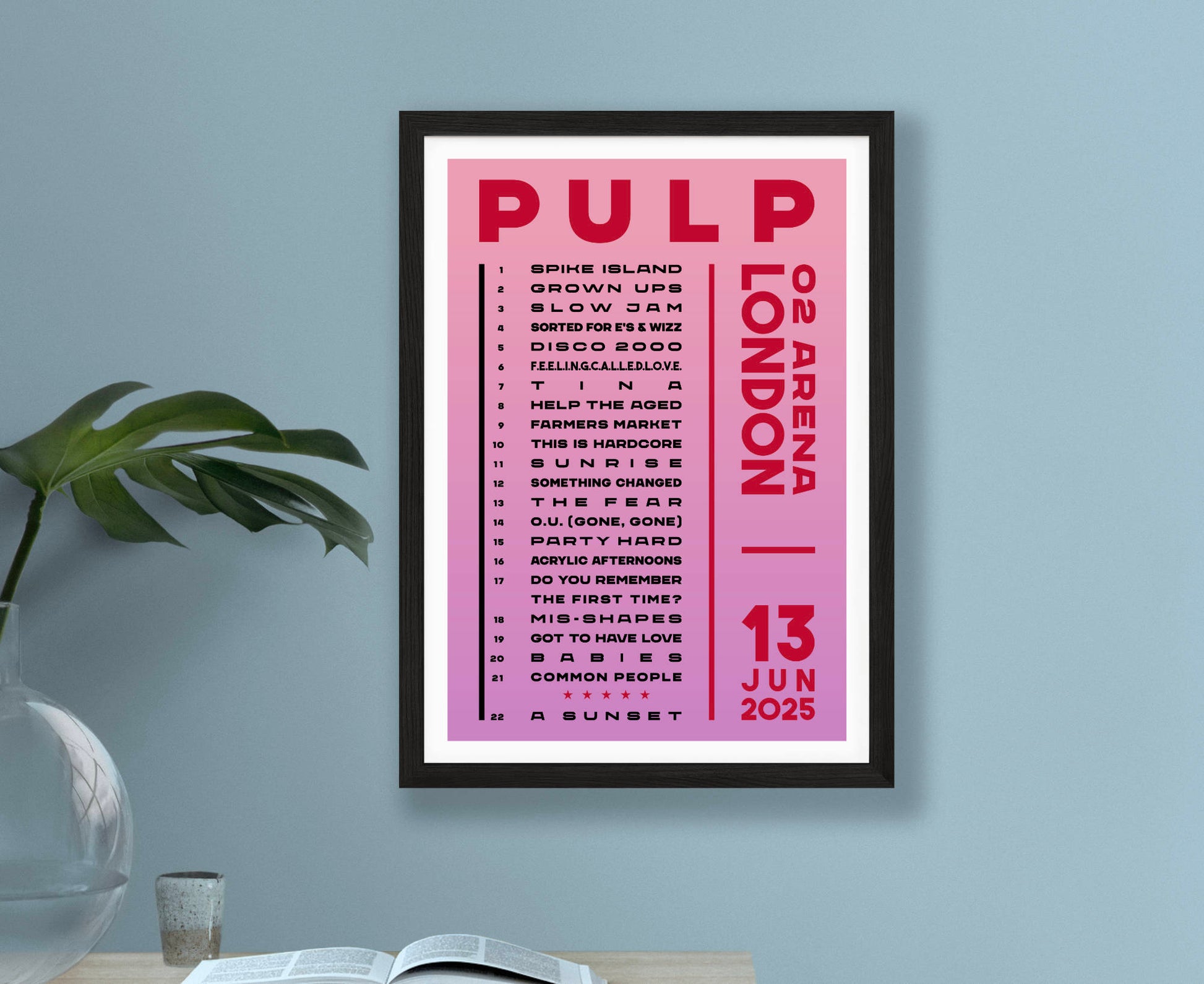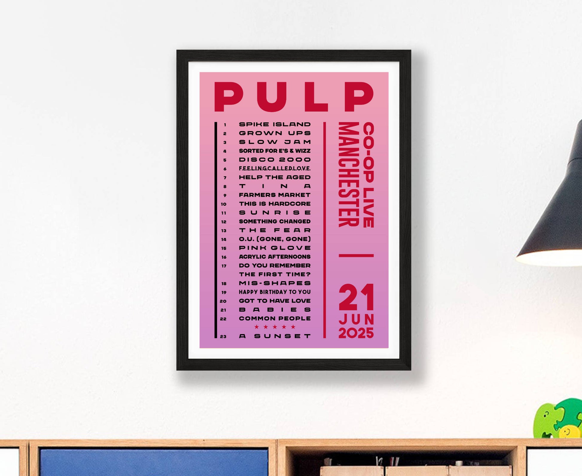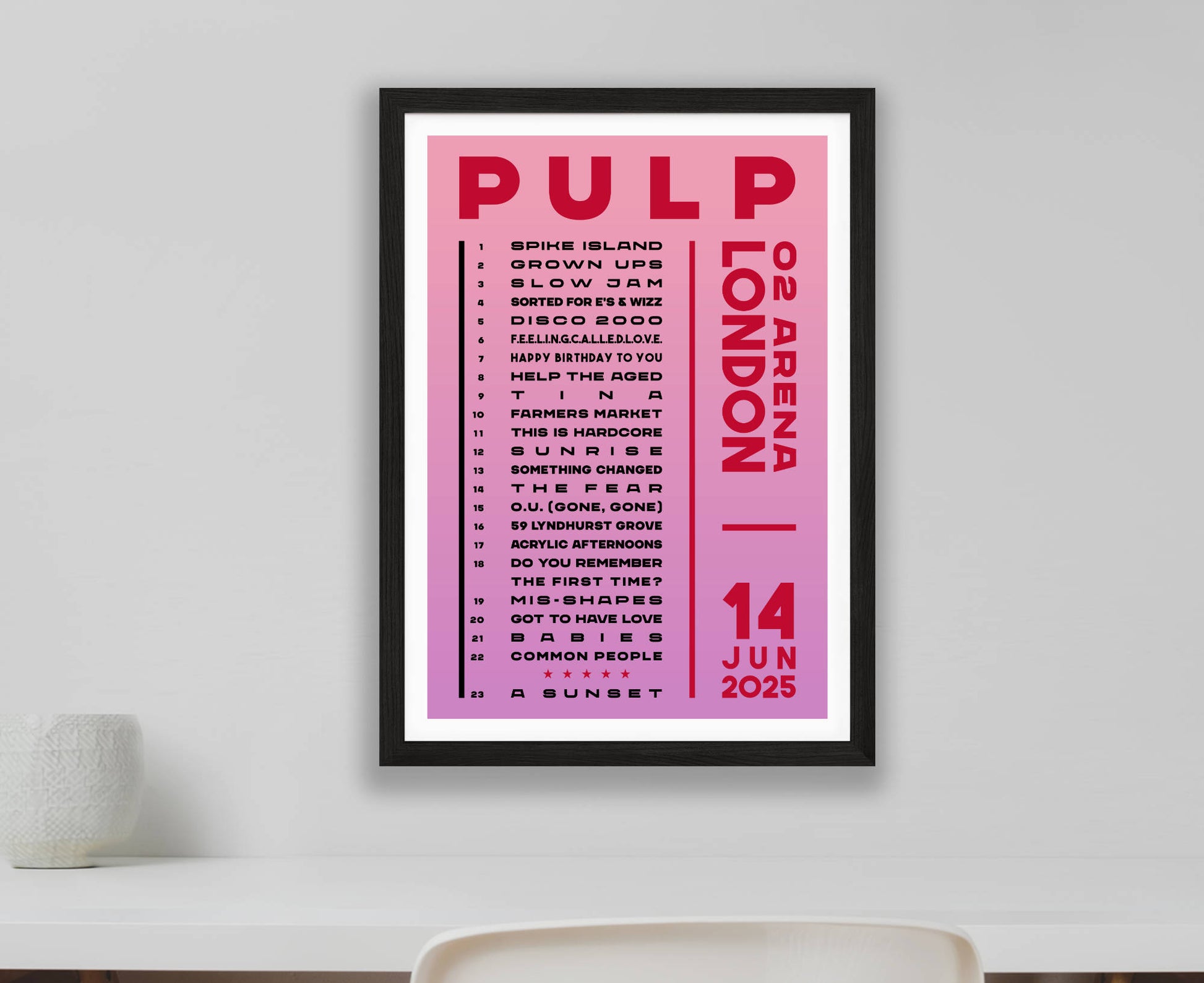 Celebrate a great gig with an original typographic poster print featuring the set list of songs played at Pulp's 2025 UK & Ireland arena shows. The colour scheme is red and black on a pink/purple gradient.