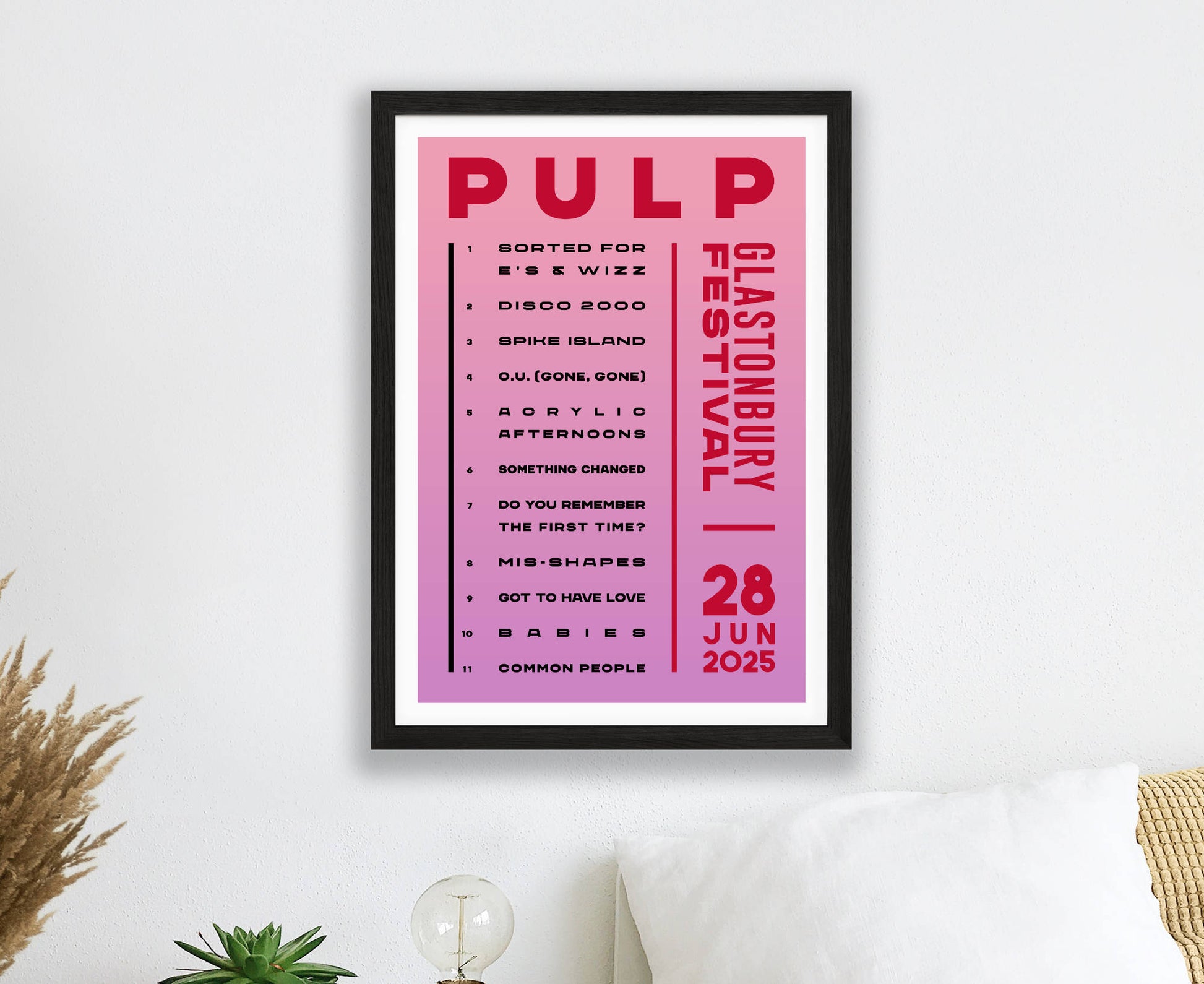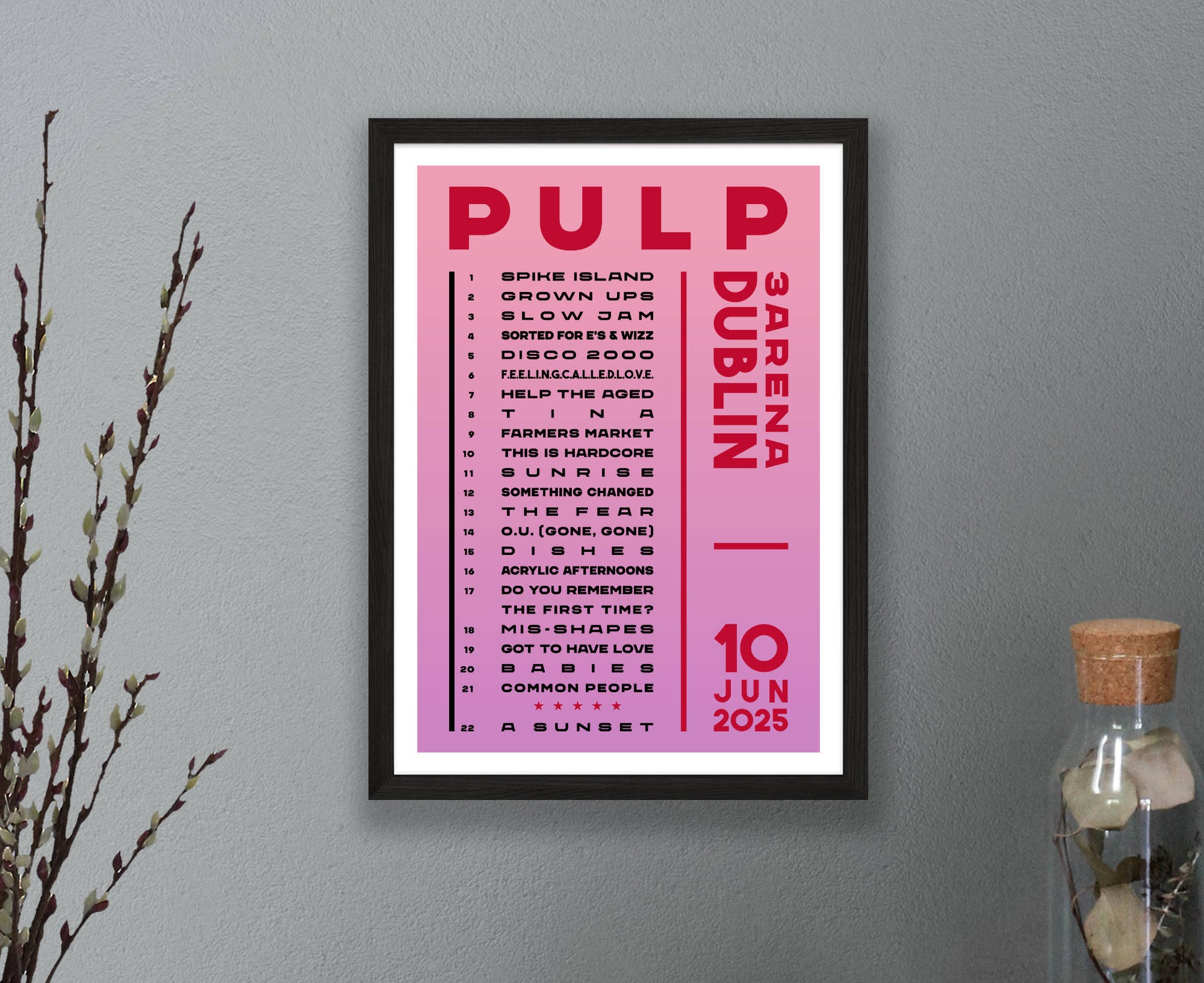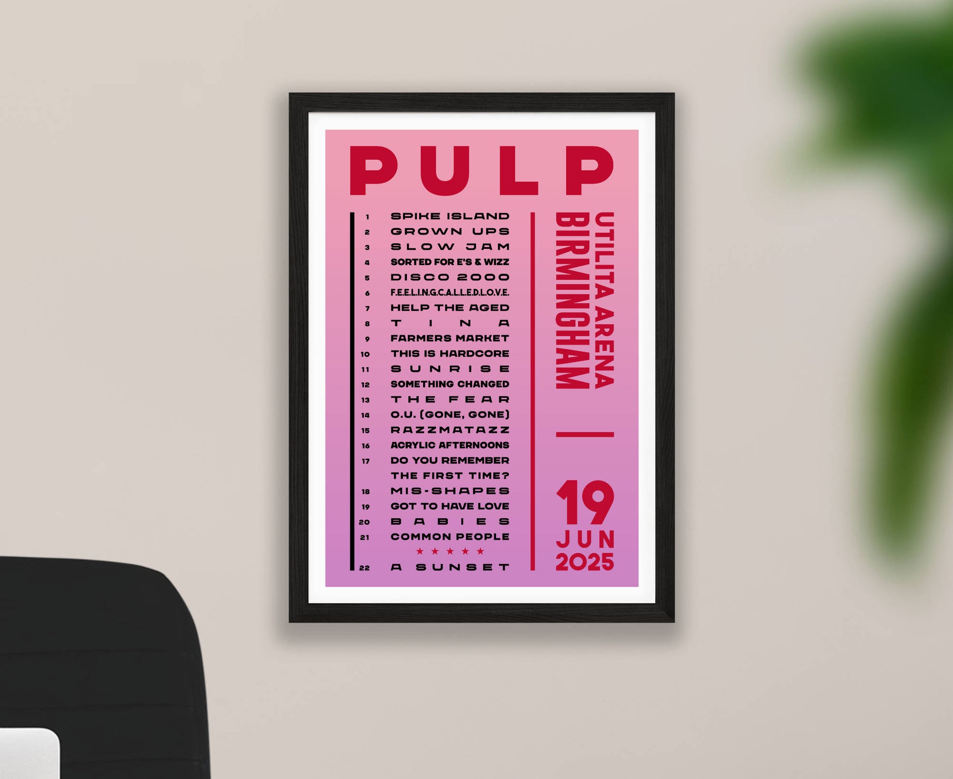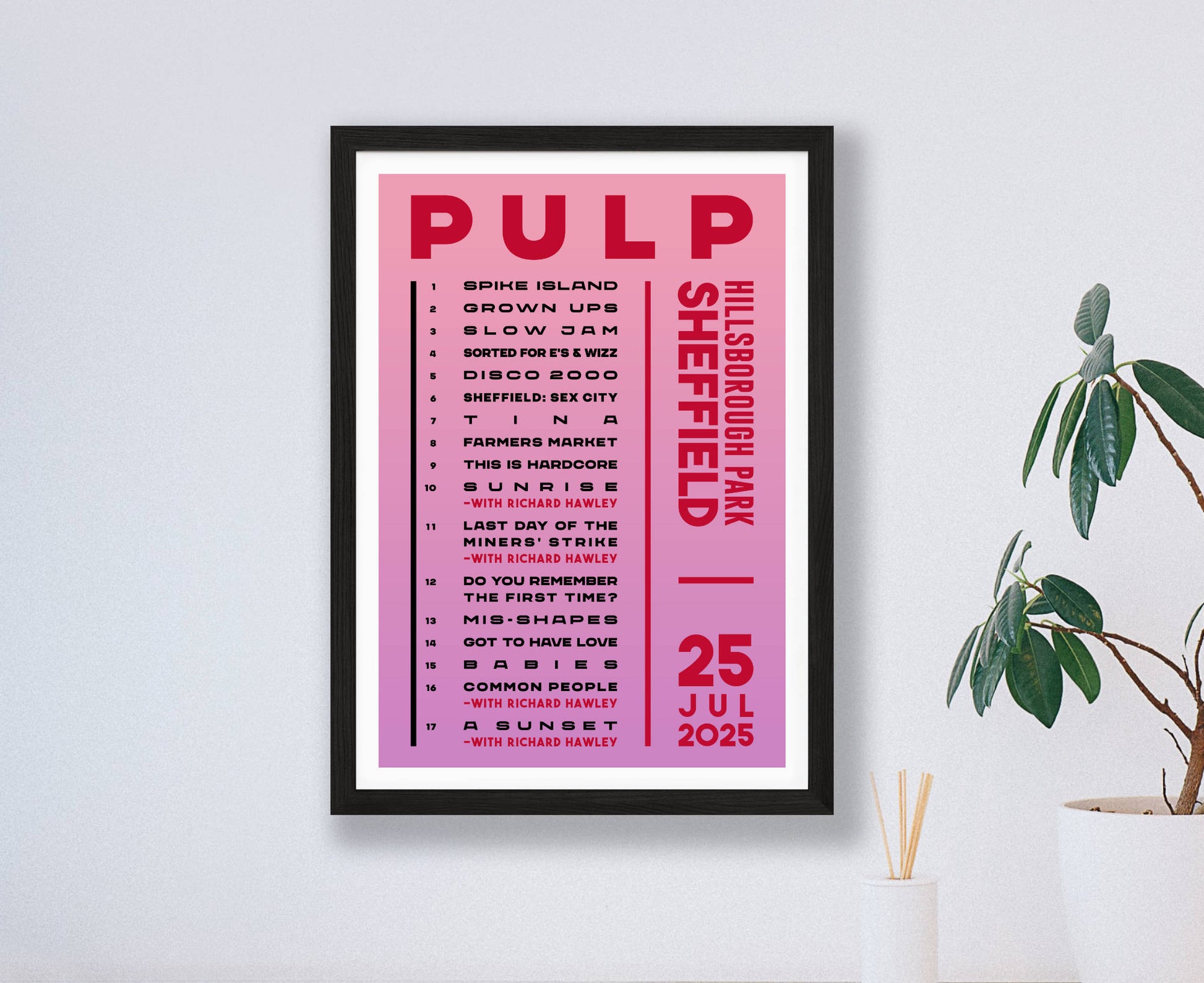 Celebrate a great gig with an original typographic poster print featuring the set list of songs played at Pulp's 2025 UK & Ireland arena shows. The colour scheme is red and black on a pink/purple gradient.