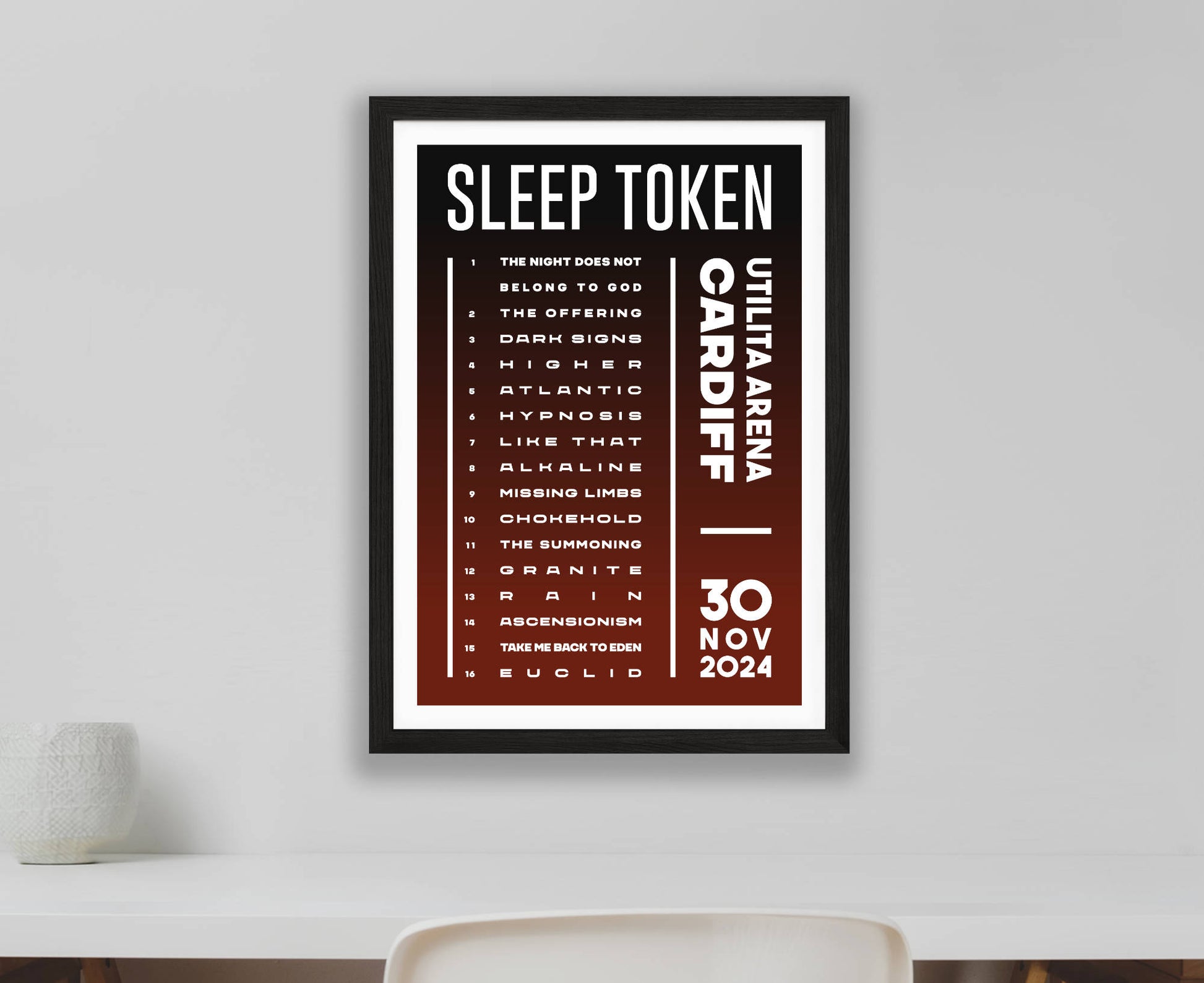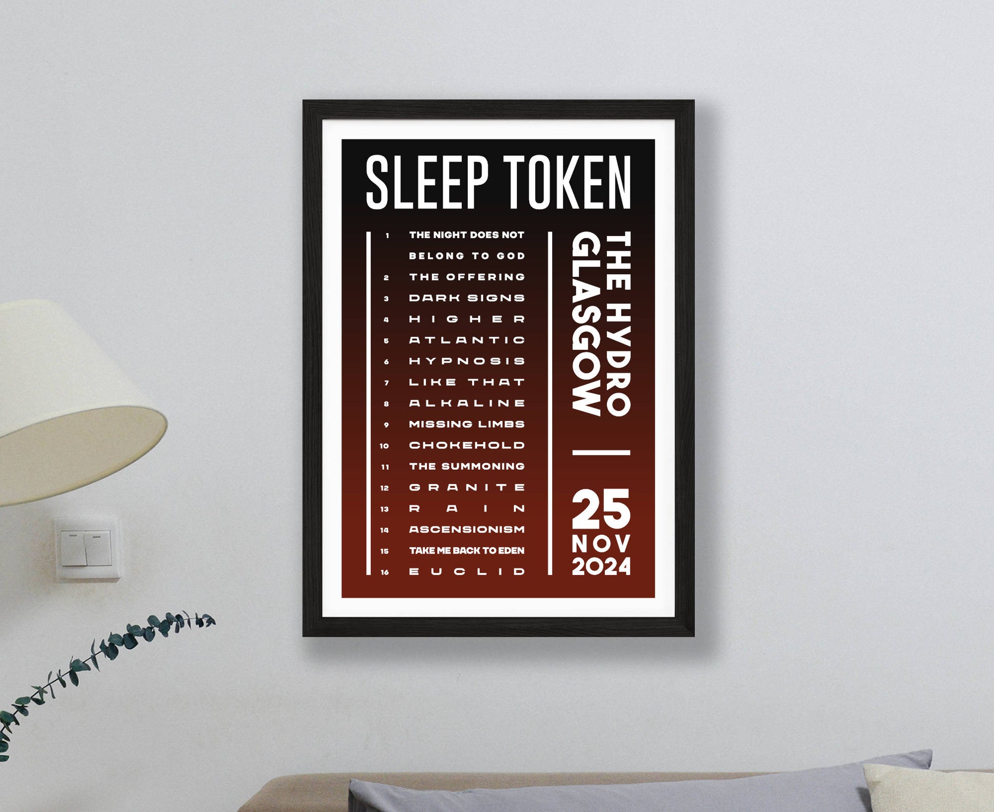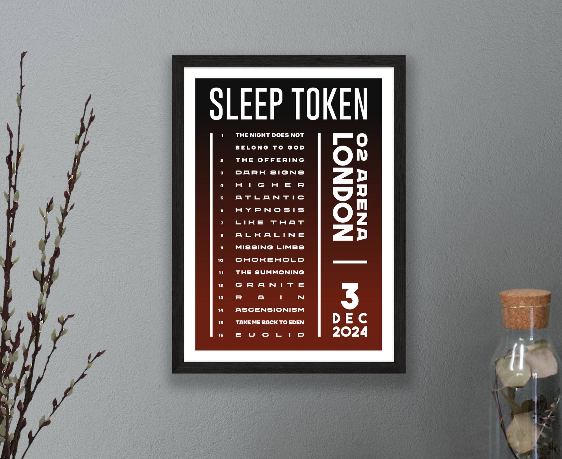 Celebrate an amazing live show with an original typographic poster print featuring the set list of songs played at Sleep Token's 2024 UK & Ireland shows. White text on a black/dark red gradient background.