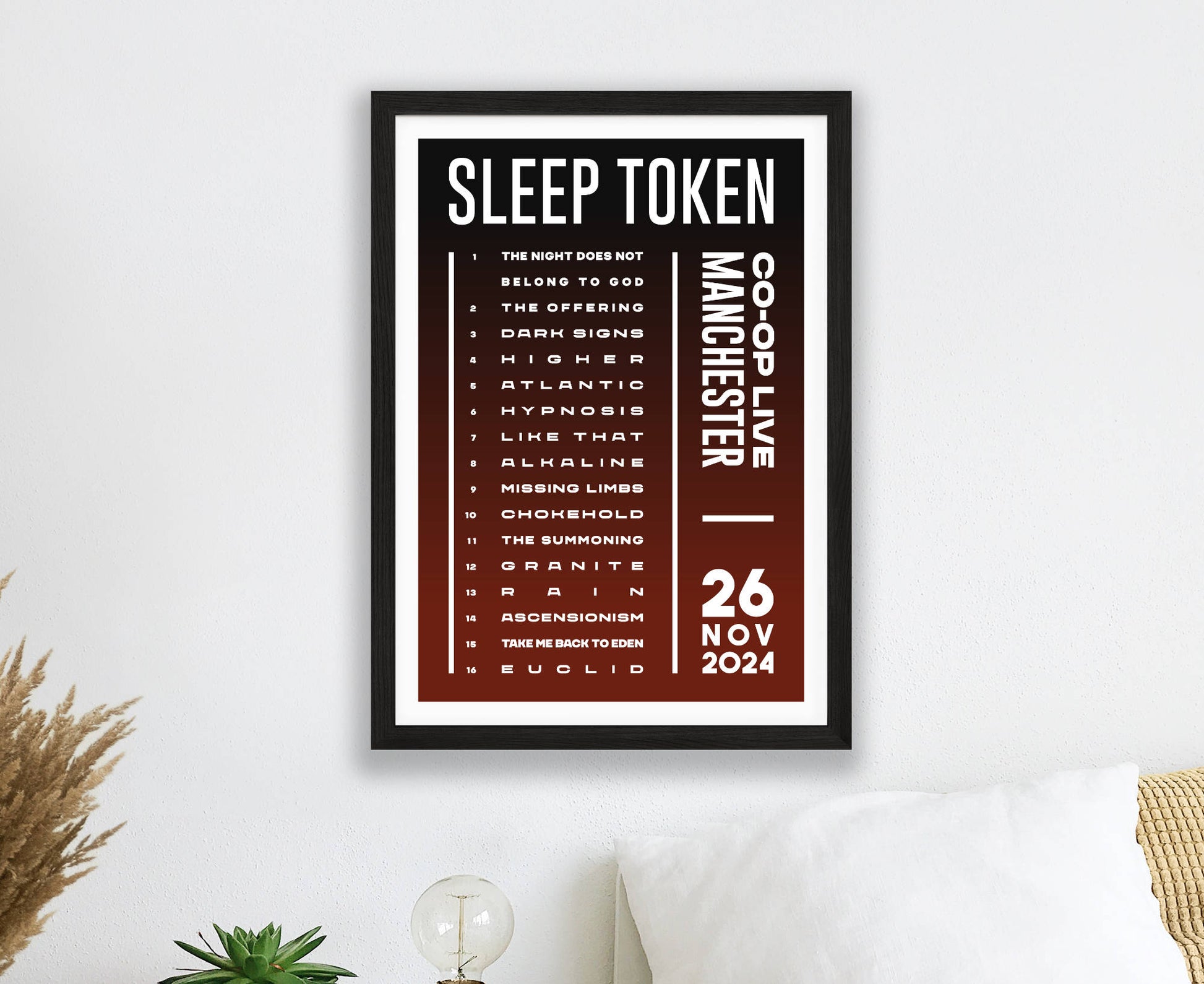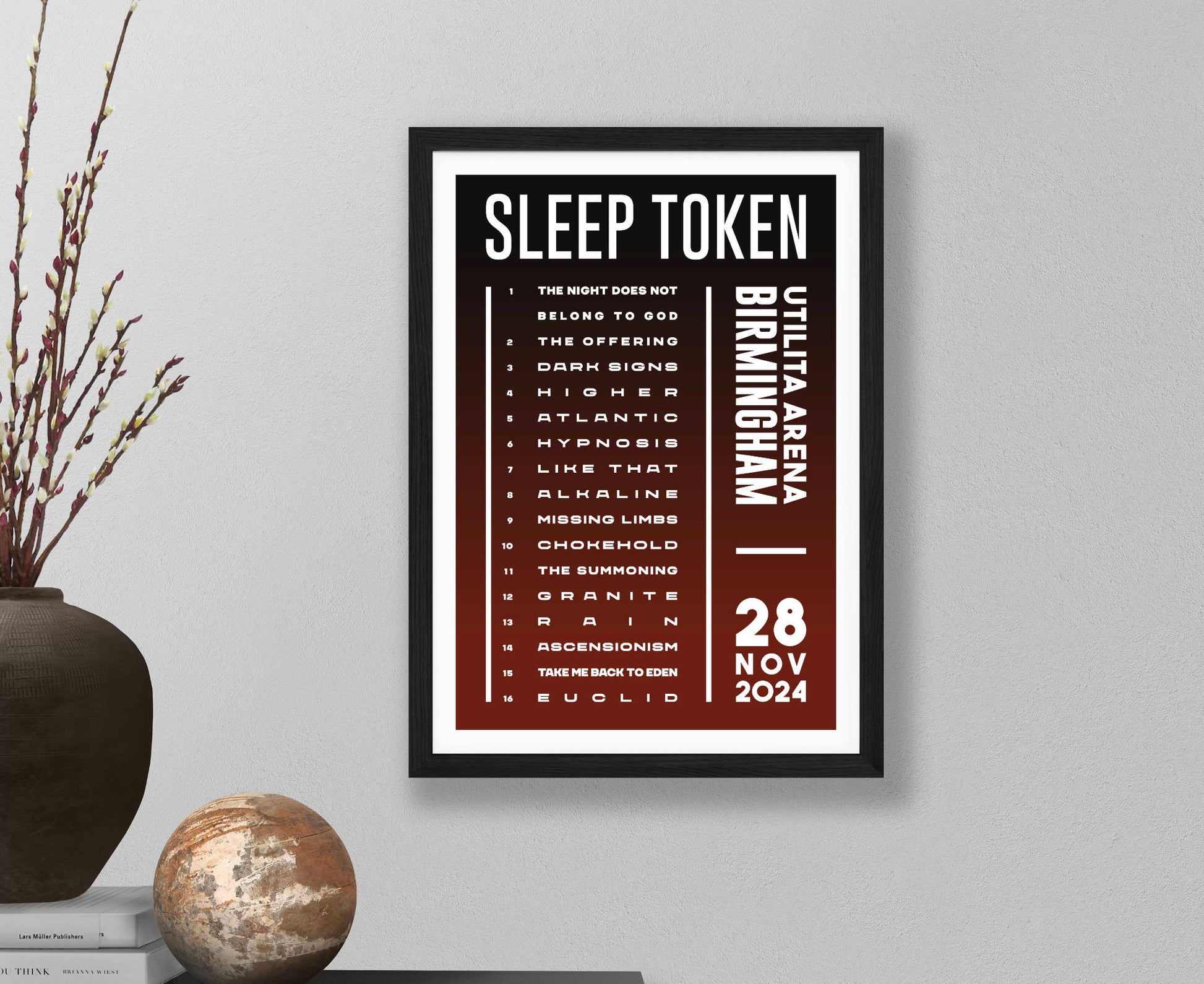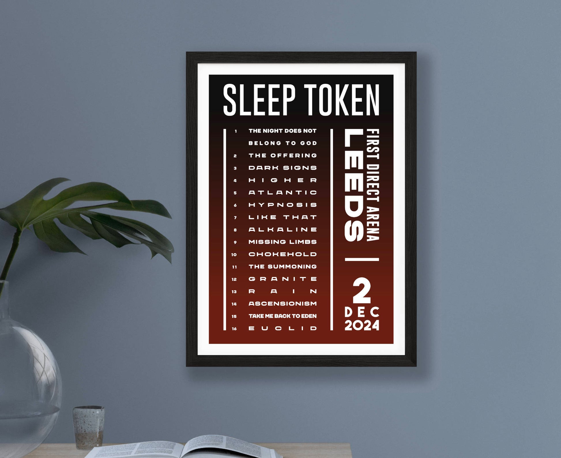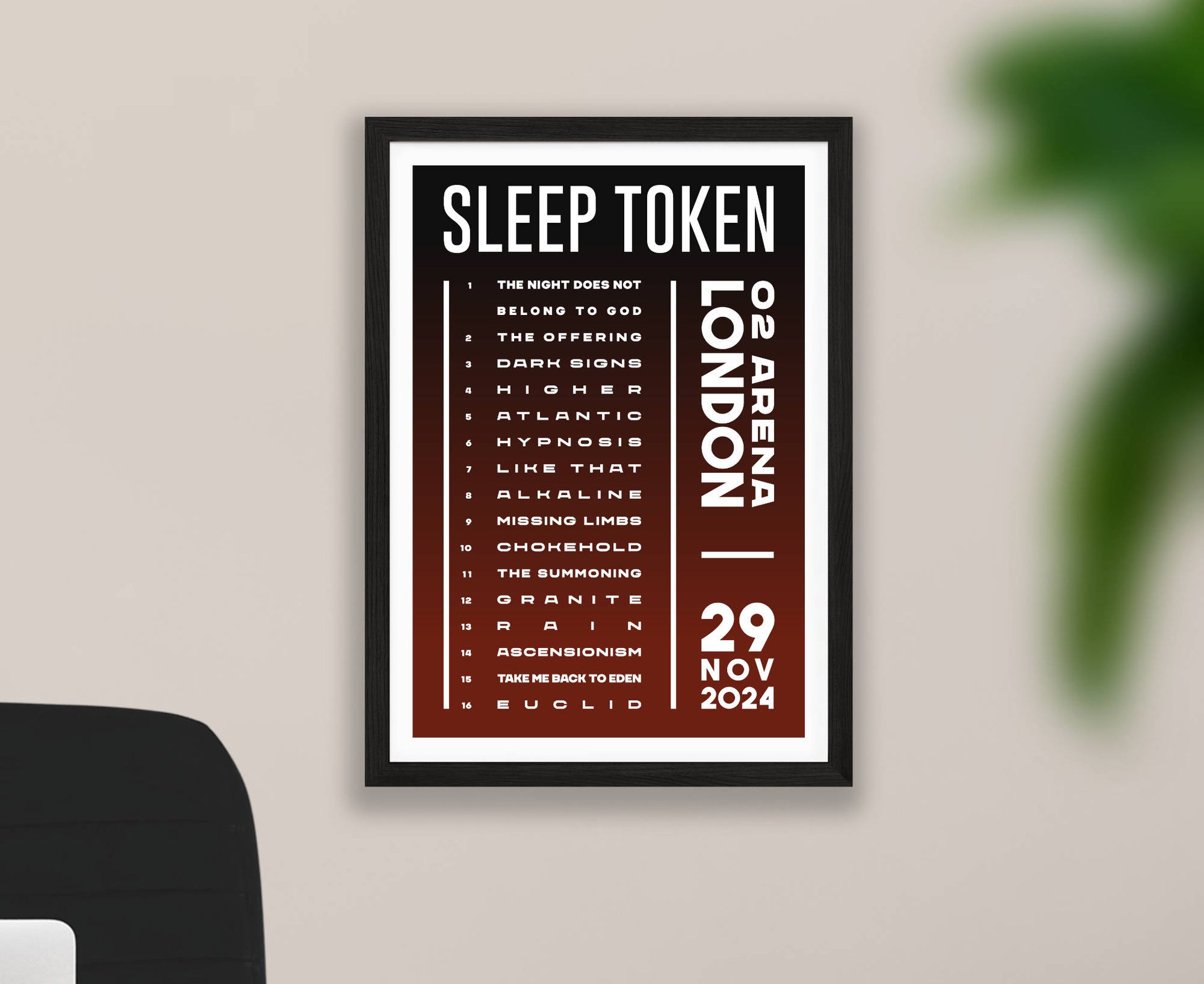 Celebrate an amazing live show with an original typographic poster print featuring the set list of songs played at Sleep Token's 2024 UK & Ireland shows. White text on a black/dark red gradient background.