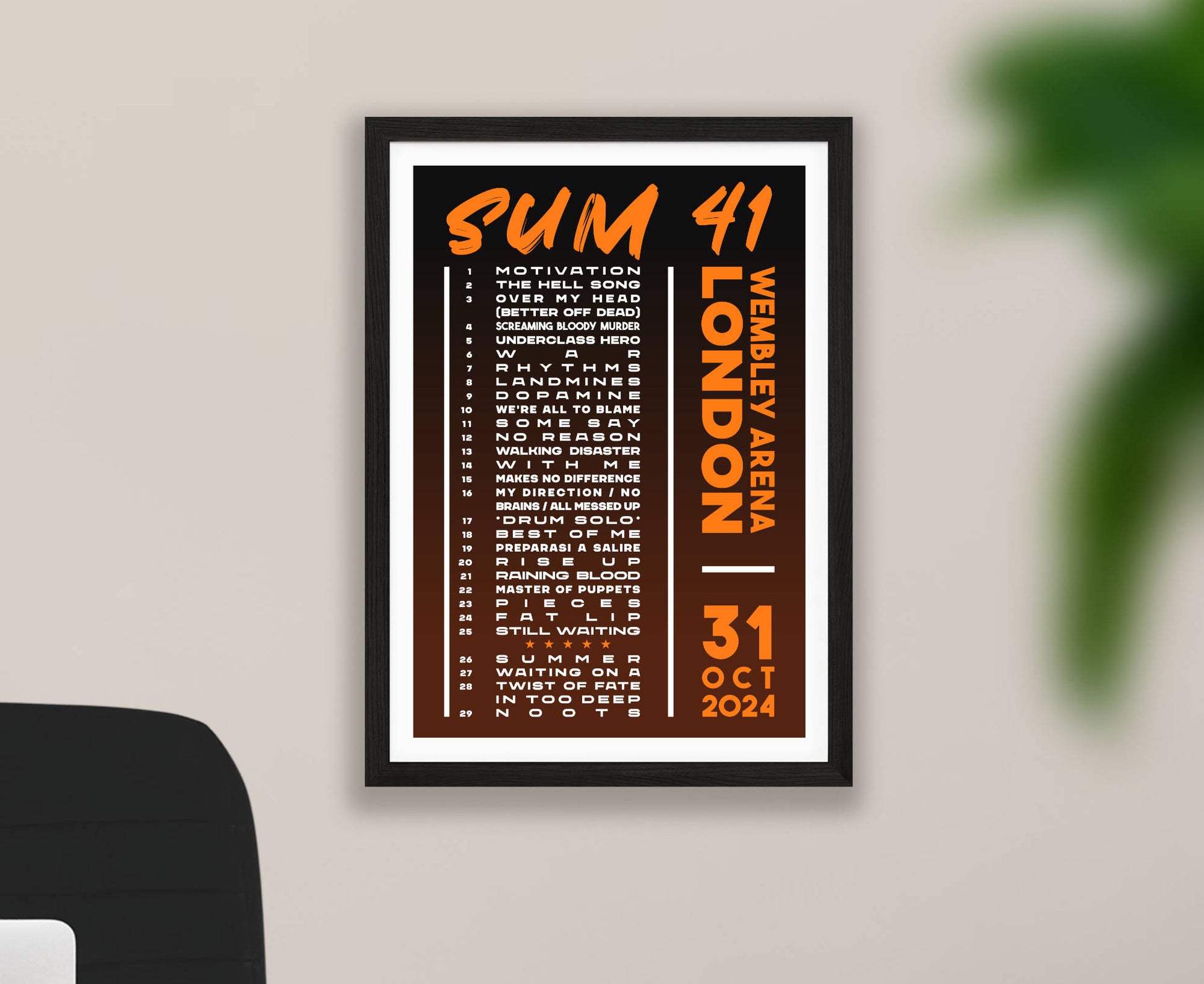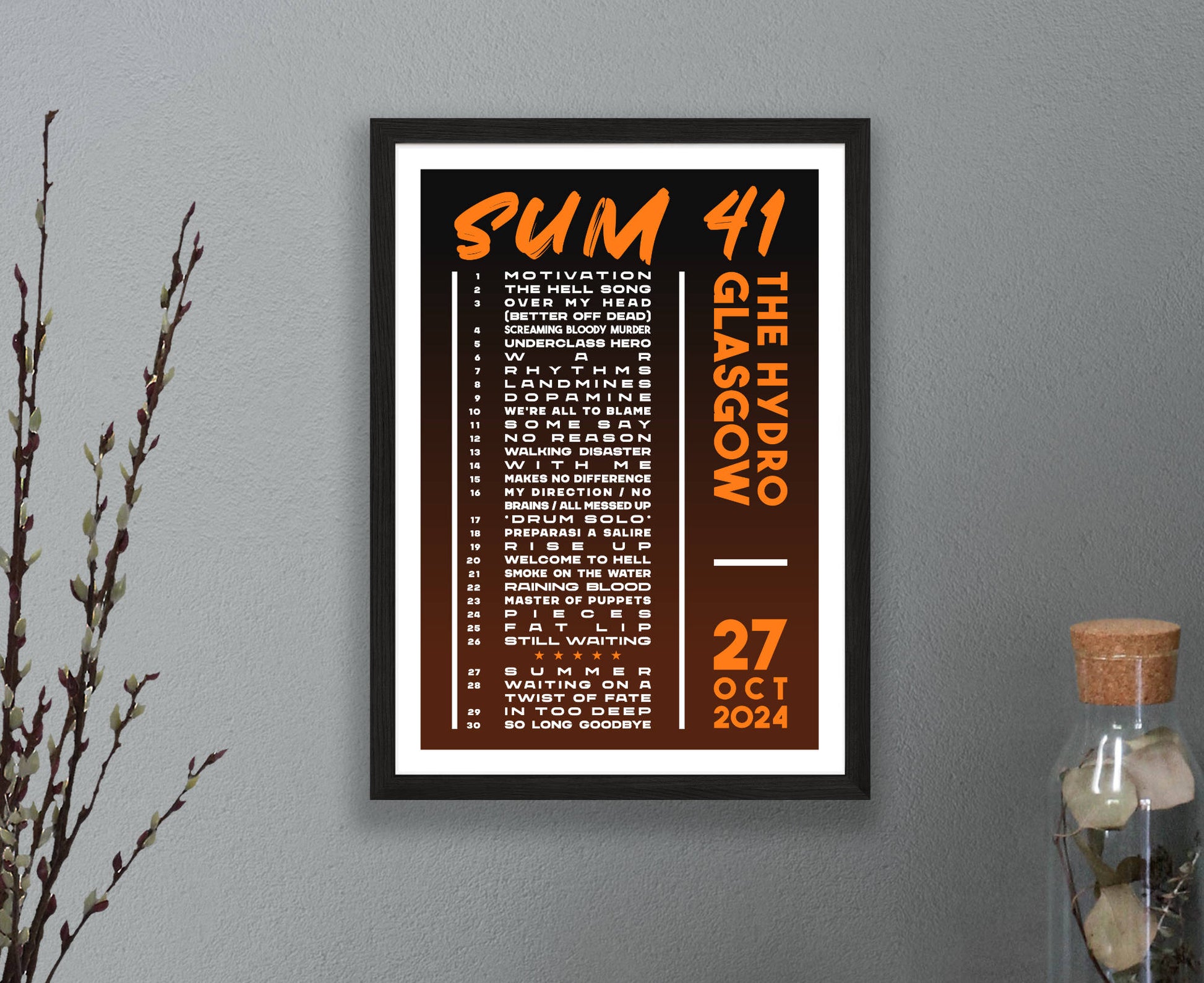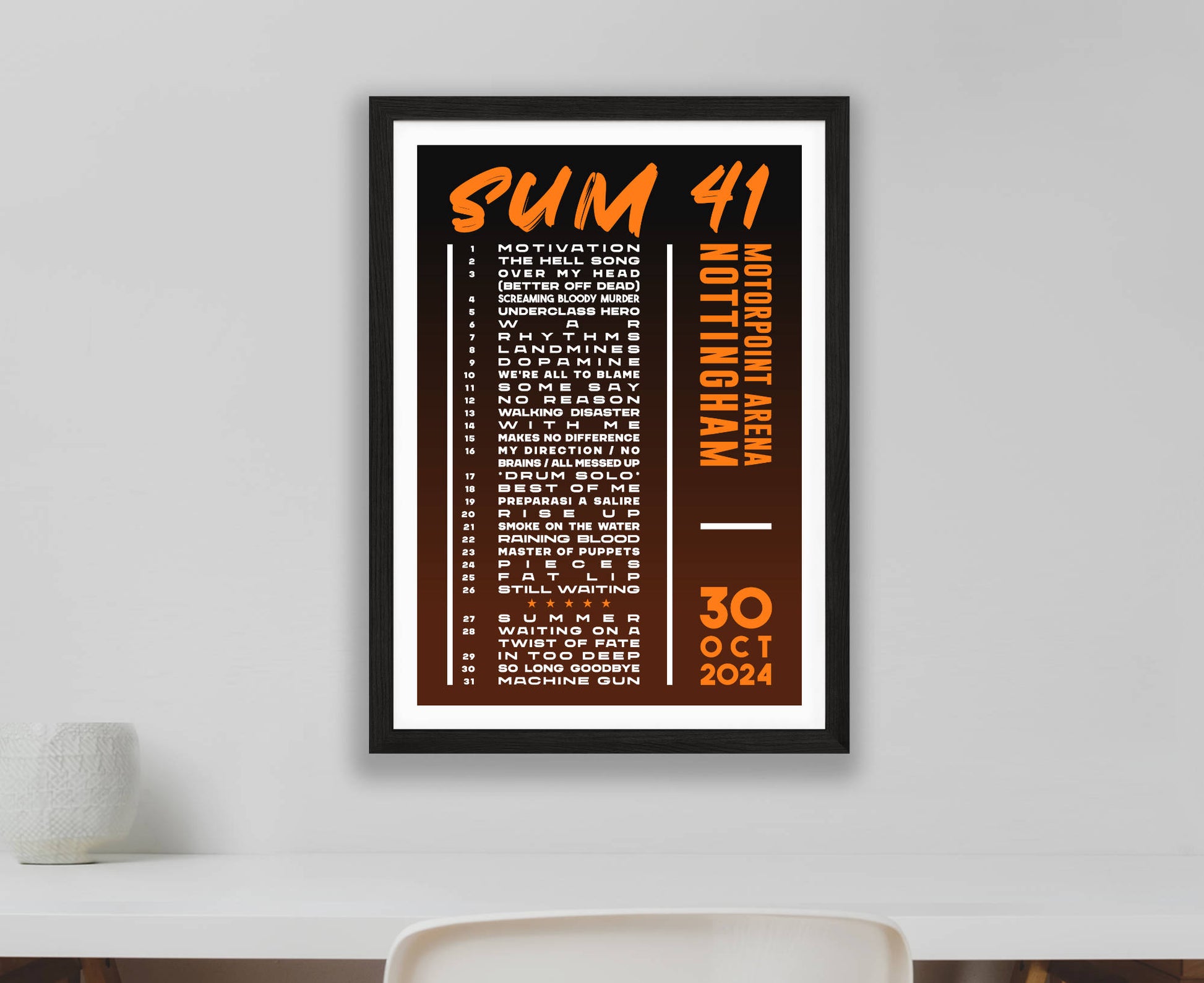 Celebrate a fantastic live gig with an original typographic poster print featuring the set list of songs played at Sum 41's 2024 UK arena shows. The colour scheme is orange and white on a black/dark orange gradient.