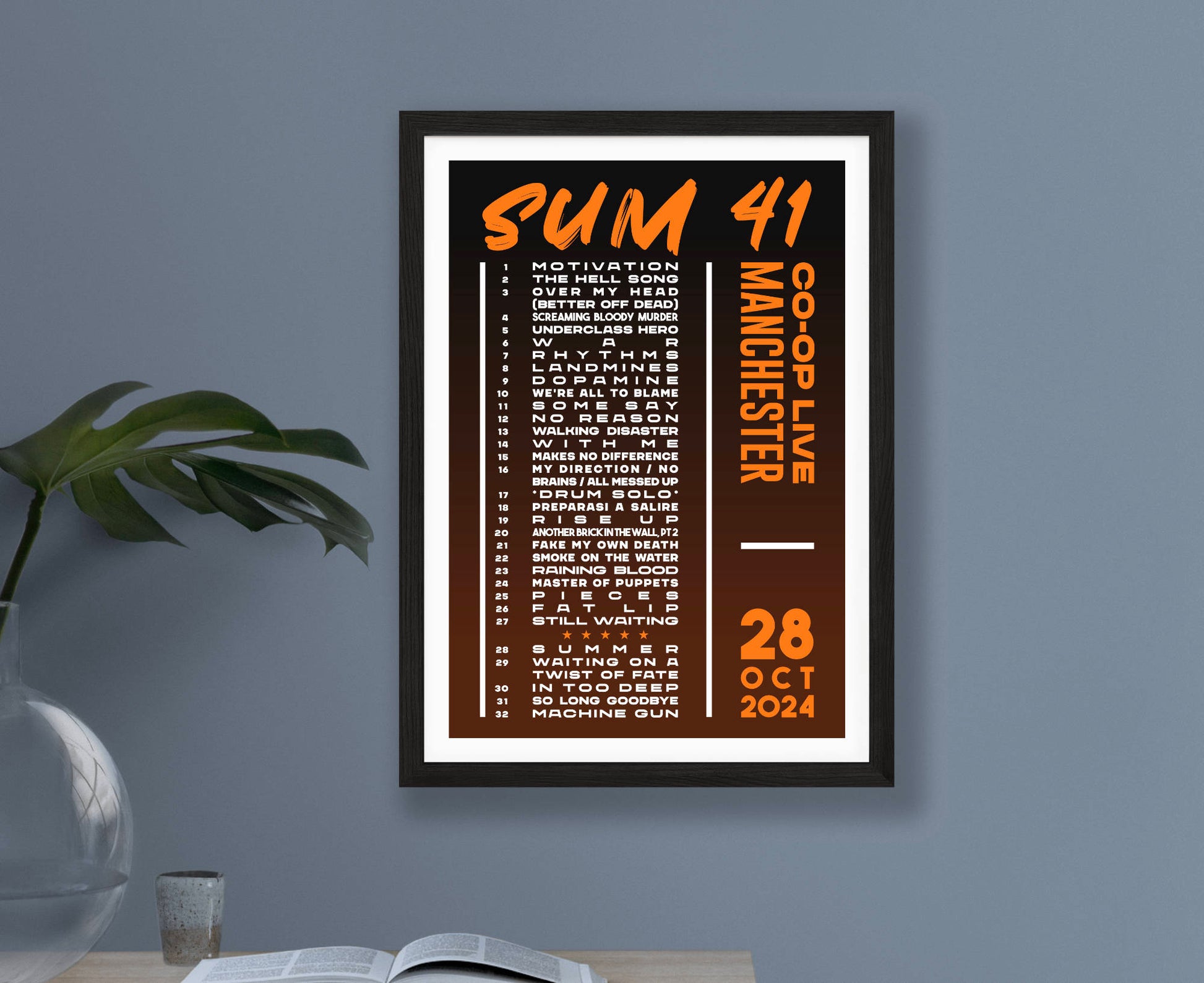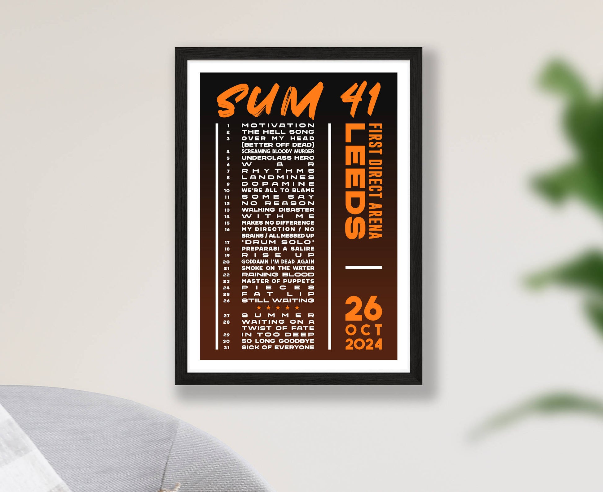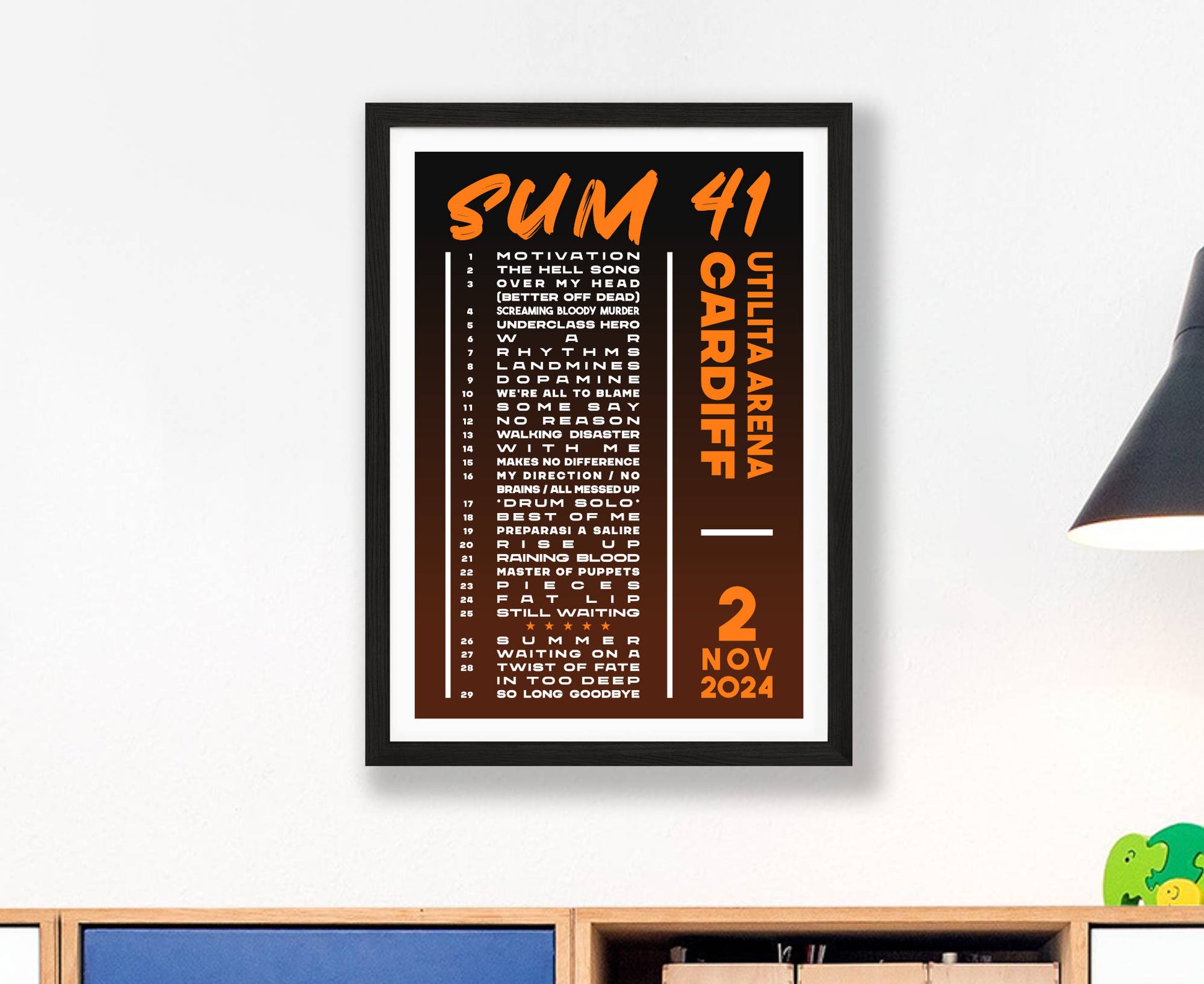 Celebrate a fantastic live gig with an original typographic poster print featuring the set list of songs played at Sum 41's 2024 UK arena shows. The colour scheme is orange and white on a black/dark orange gradient.