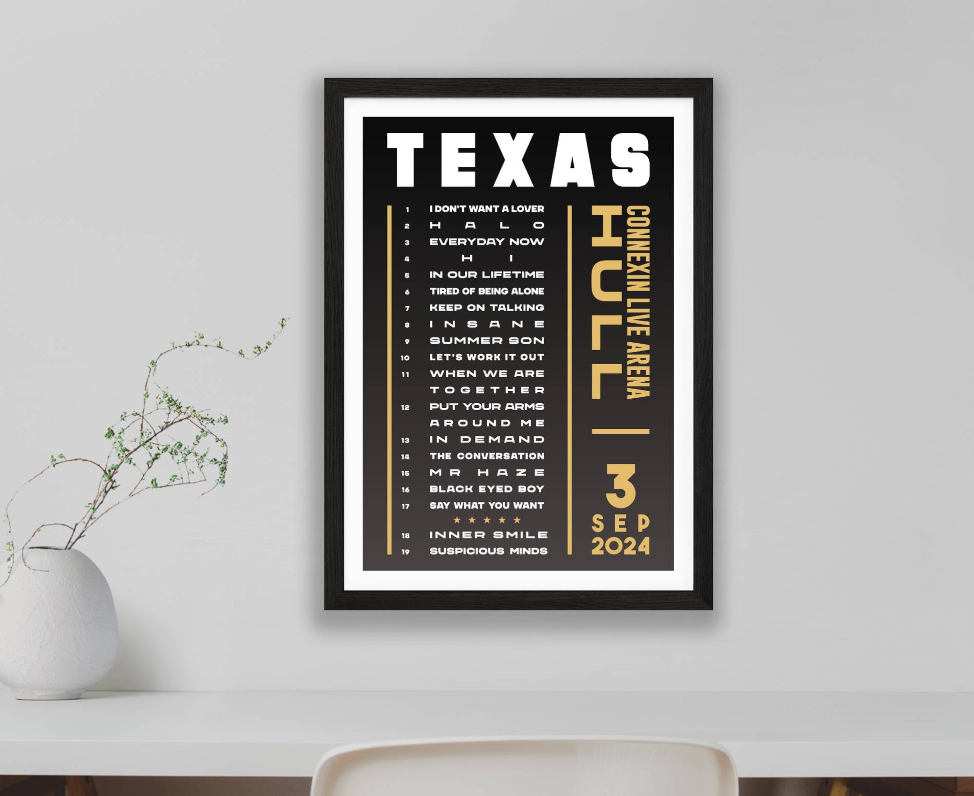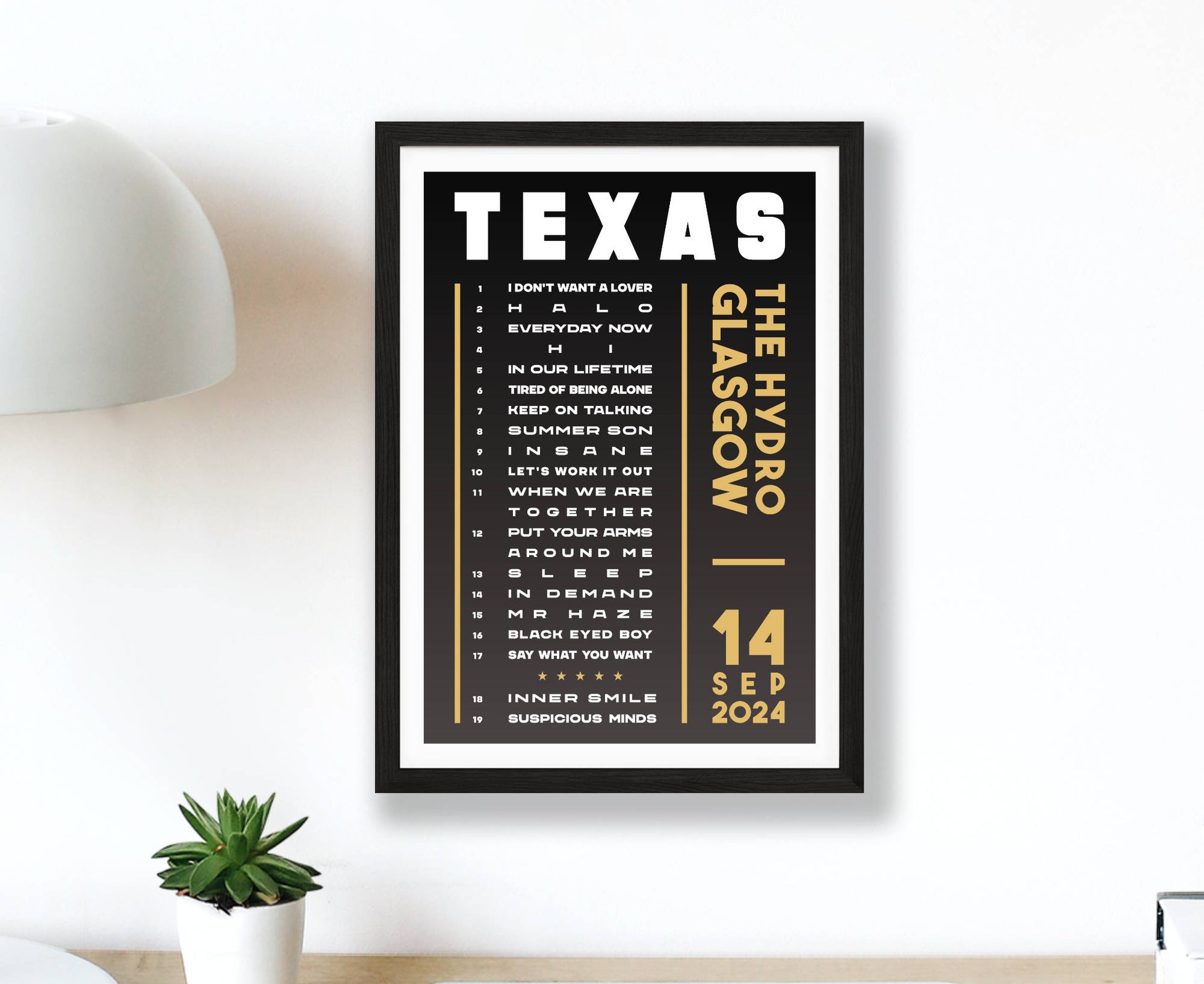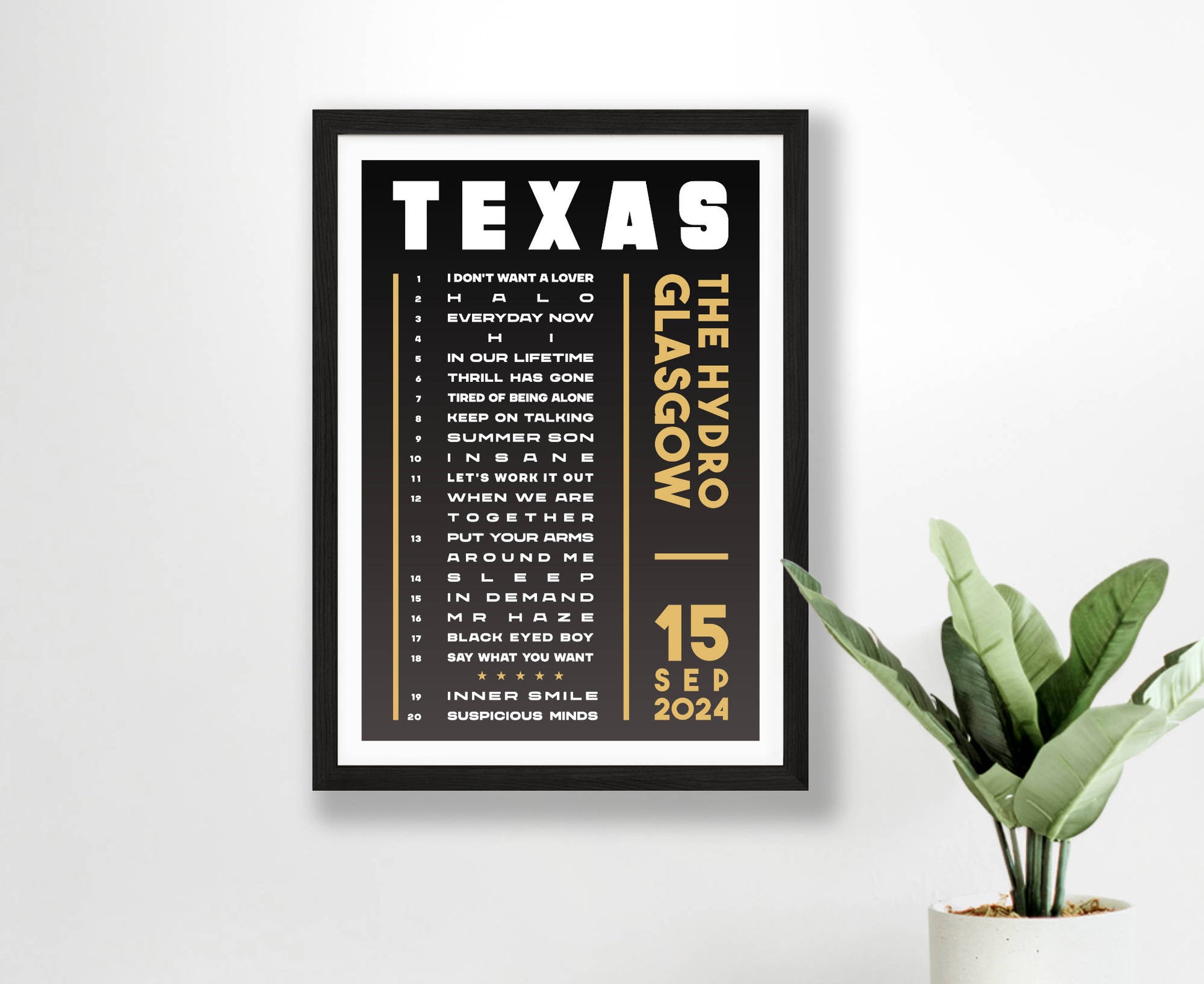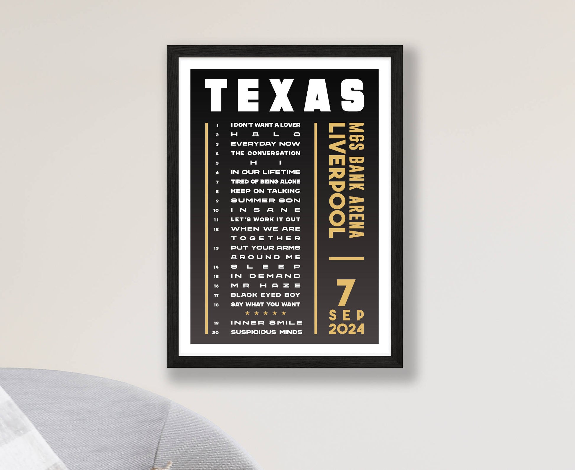Celebrate a fantastic live show with an original typographic poster print featuring the set list of songs played at Texas's 2024 'The Very Best Of' UK tour. Choose from Hull, London, Leeds, Liverpool, Bournemouth, Cardiff, Birmingham, and Glasgow (night 1 and 2).