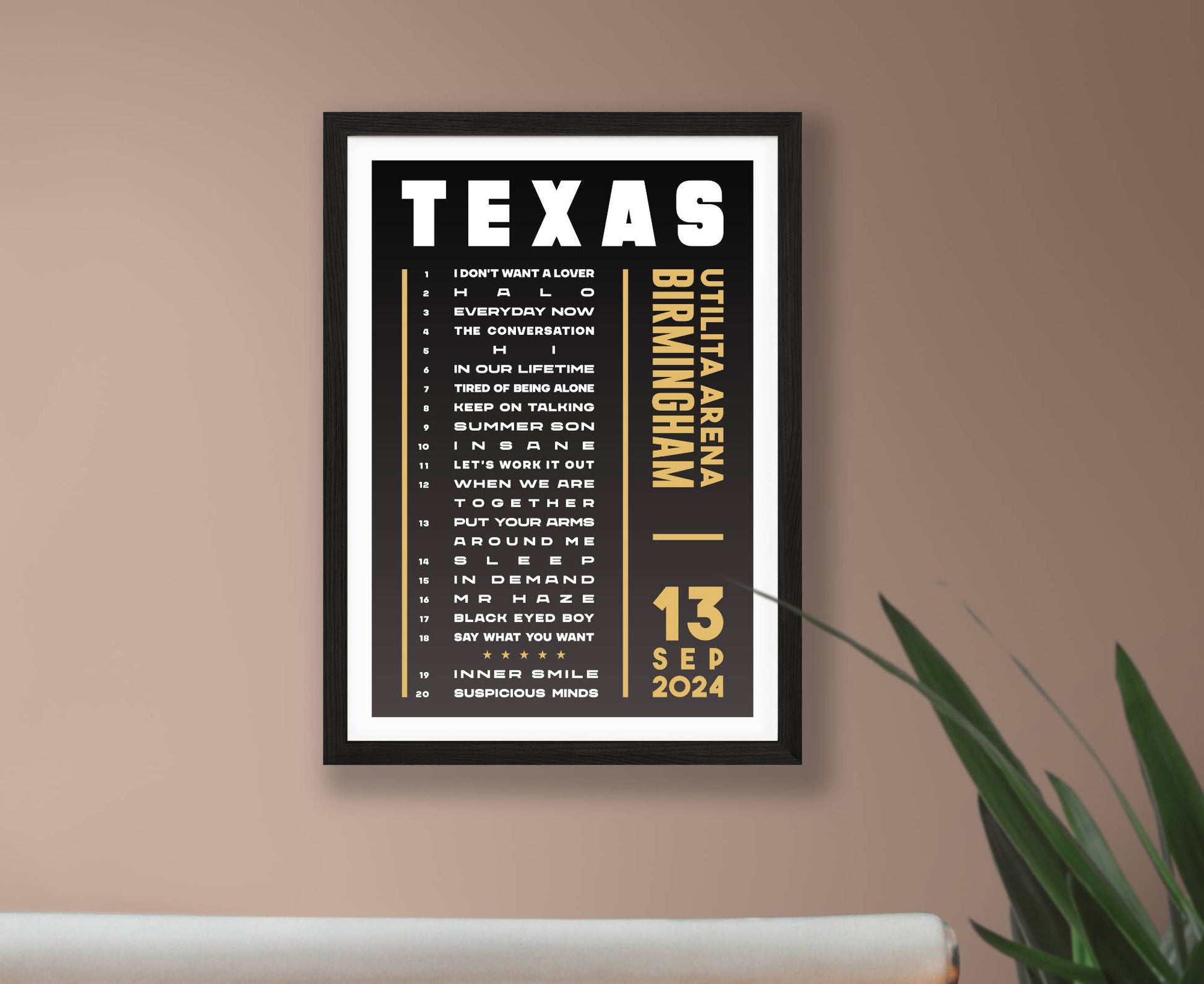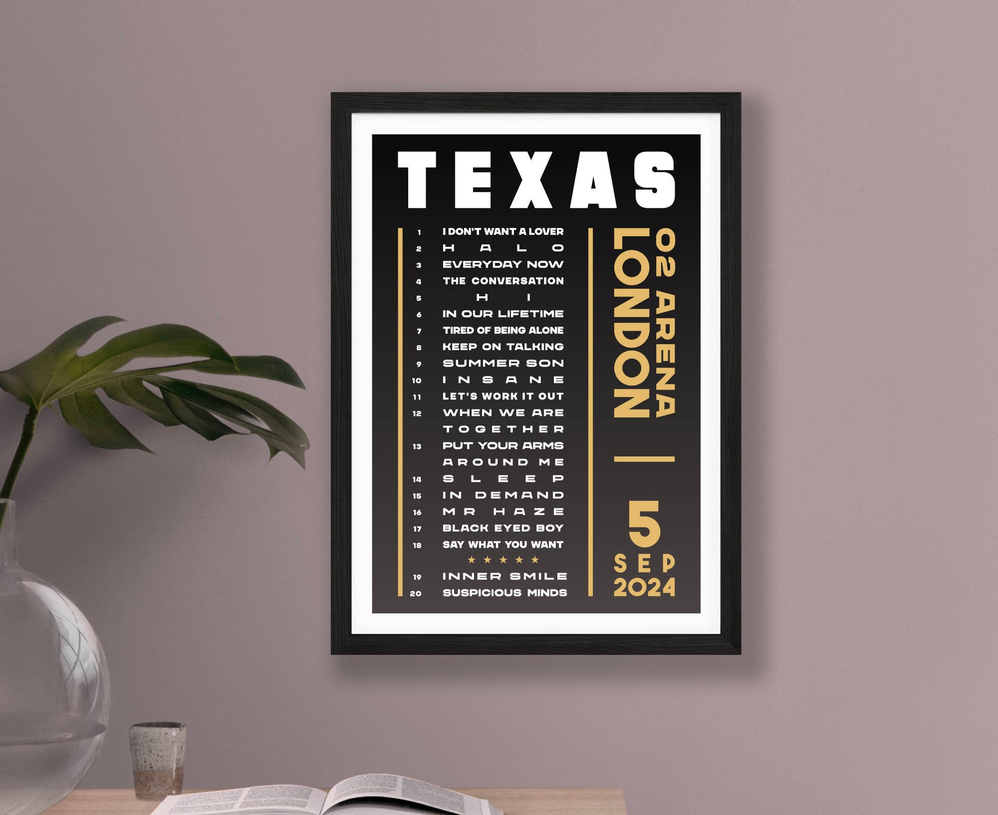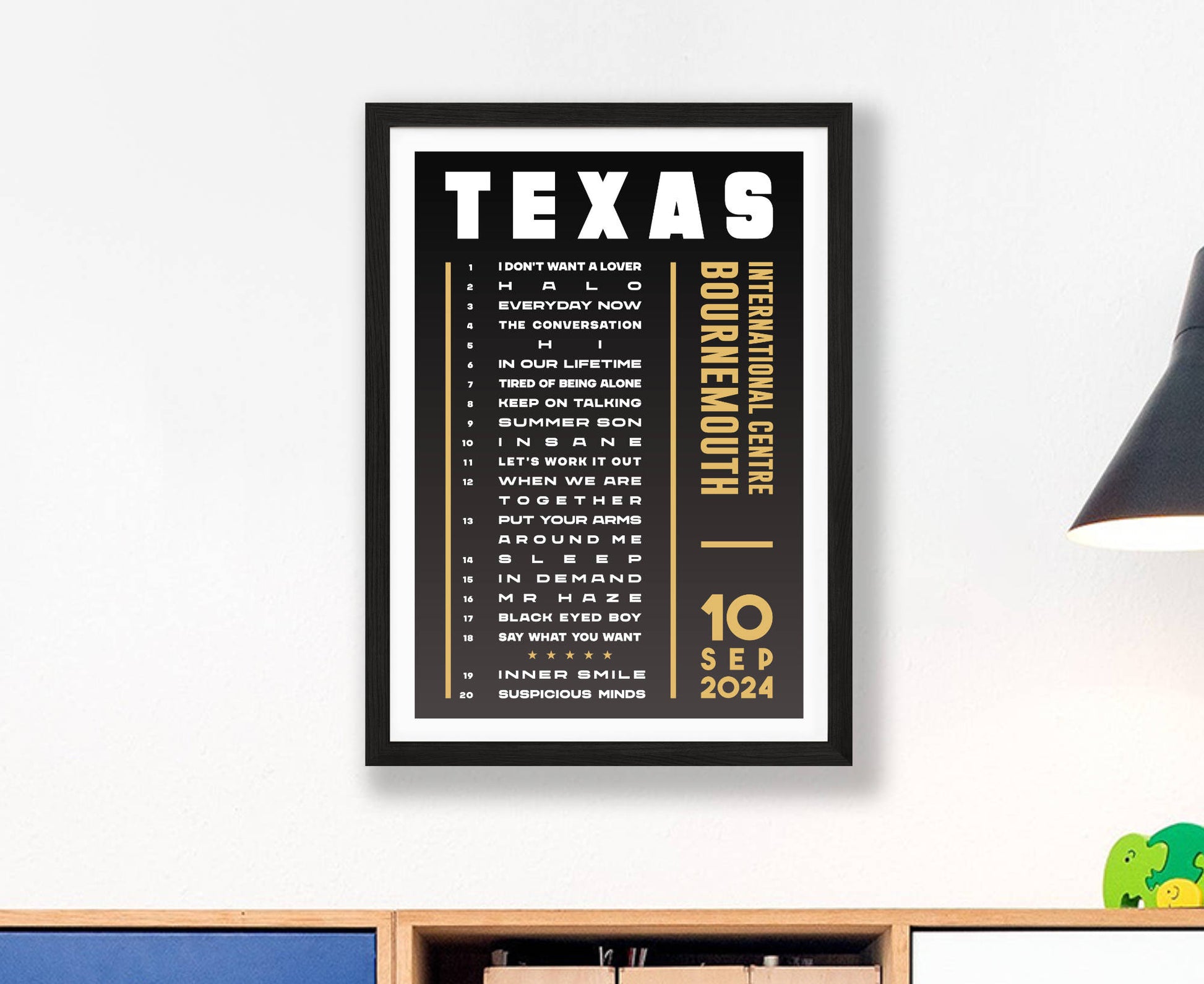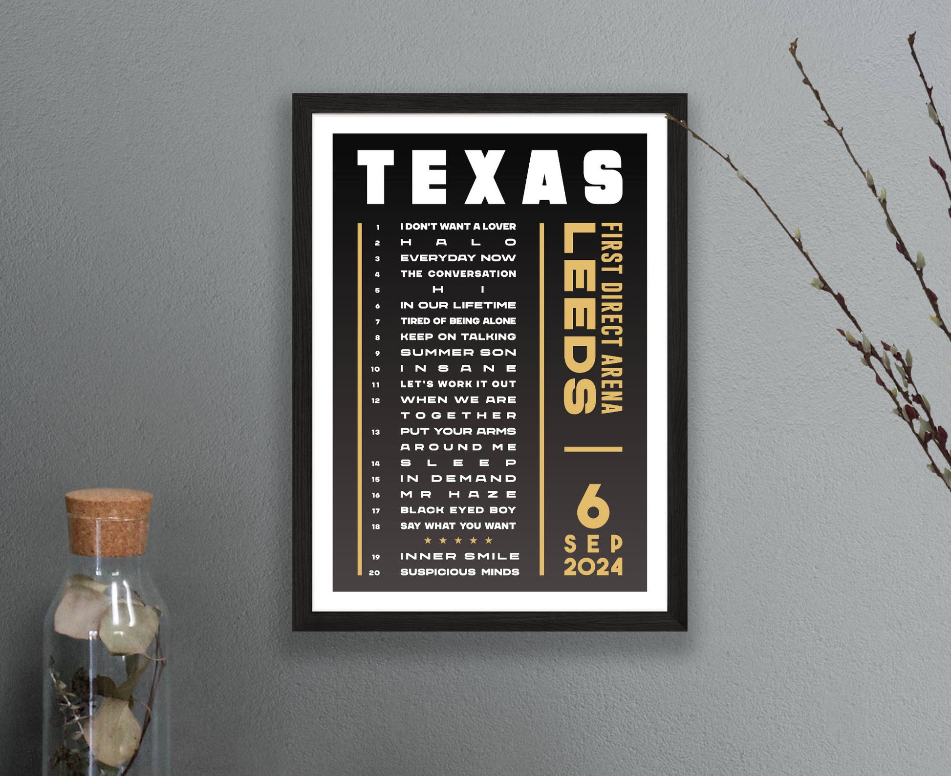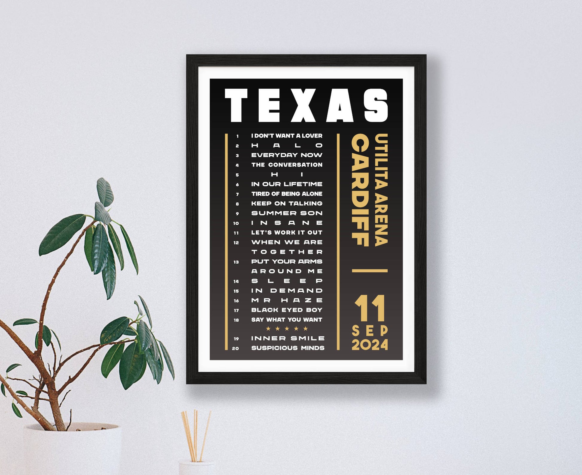 Celebrate a fantastic live show with an original typographic poster print featuring the set list of songs played at Texas's 2024 'The Very Best Of' UK tour. Choose from Hull, London, Leeds, Liverpool, Bournemouth, Cardiff, Birmingham, and Glasgow (night 1 and 2).